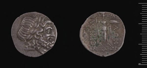 Curator: Look at the Stater of the Koinon of Thessaly, currently held in the Harvard Art Museums. The first impression is that it appears worn, almost smoothed by time. Editor: The coin's worn surface speaks volumes about its history of circulation and handling. You can see the remnants of the process used to strike these coins from the details. Curator: Indeed. The obverse features a powerful, idealized head, while the reverse depicts a figure, perhaps a deity, surrounded by inscriptions. The relief shows the skill of the die engraver. Editor: The silver from which it was made, probably sourced locally, shows the economic power and resources of Thessaly at the time of its minting. The coin’s very material becomes a narrative in itself. Curator: The composition and the deliberate arrangement of symbolic elements create a visual language that reflects the values and identity of the Thessalian people. Editor: I find that fascinating—the idea that everyday currency could also function as a portable declaration of identity, produced with the clear intent to circulate a message with the coin. Curator: It's a powerful intersection of form and function. Editor: It truly does highlight how material and social forces shaped even the smallest objects.