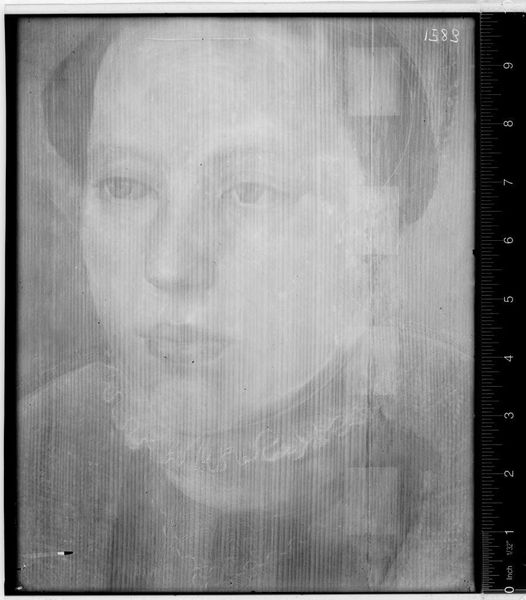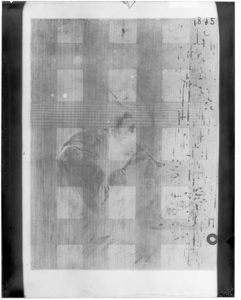 Curator: Here we have an x-radiograph of "Interior" after Gerard Terborch, a 17th-century Dutch painter. Editor: It’s like seeing a ghost behind a very pixelated screen. Ethereal, yet strangely fragmented. Curator: X-radiography allows us to peer beneath the surface of the artwork, potentially revealing underdrawings or changes made during the painting process. It's a hidden narrative exposed. Editor: It feels like a metaphor for unveiling secrets, doesn't it? The grid adds this layer of imposed order to something fundamentally mysterious, like trying to rationalize the subconscious. Curator: Perhaps. The grid pattern could relate to the canvas weave itself, further emphasized by the radiographic process, exposing a symbolic skeleton. Editor: It’s also a beautiful reminder that even in the most meticulously crafted works, there's always an unseen dimension, a hidden history waiting to be discovered. Curator: Indeed, the layers of meaning add so much depth. Editor: Precisely!