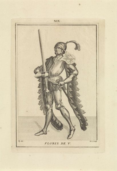 Editor: Here we have a piece entitled "Portret van Dirk IV, graaf van Holland" – or "Portrait of Dirk IV, Count of Holland" created around 1745 by Hendrik Spilman. It's an engraving, giving it this detailed, almost delicate feel. What strikes me most is the detailed armor. How can we interpret it? Curator: Let’s consider the means of production. Engraving, a labor-intensive process, democratized image reproduction. Think about who commissioned this: was it for widespread consumption or for a limited, elite audience reinforcing a particular narrative of Dutch history? Editor: So, you're saying the medium itself influences the message? How so? Curator: Precisely! Engraving allowed for the mass production of images, but also demanded skilled labor and access to specific materials - metal plates, inks. Was Spilman commenting on craftsmanship or merely exploiting a profitable method? Also, consider the subject, Dirk IV. How is his status as a count represented through the precise rendering of his armor? Is the focus really on *him*, or on the armor that signifies his power? Editor: The armor feels so central, now that you mention it. I initially just saw it as decoration, but now I understand how it is related to labor, materials, and status... Curator: Yes, and think about what that armor represents materially: the resources needed to forge it, the labor of the artisans, the military power it symbolizes. This isn't just a portrait; it's a material representation of power, status, and the means by which they were maintained. Editor: This makes me appreciate not only Spilman’s talent, but also the value society placed on these signifiers of power and privilege. Curator: And perhaps a commentary on the power itself – on who controls these resources. A print can be subversive if viewed through that lens.