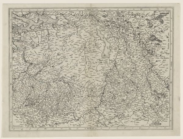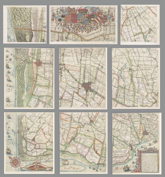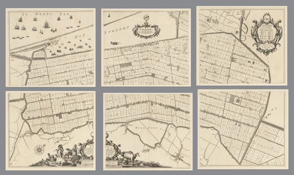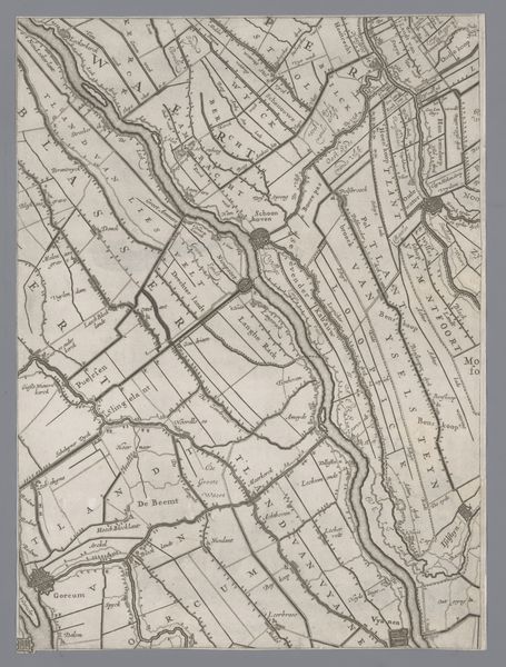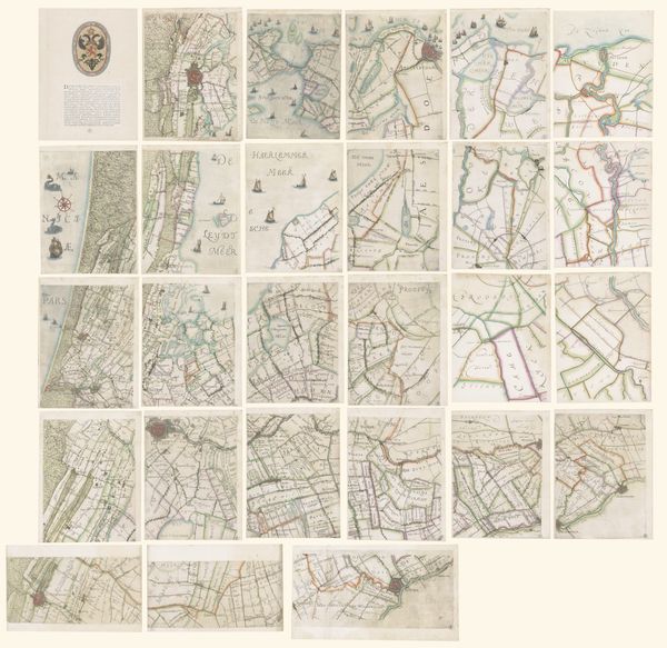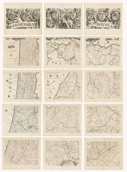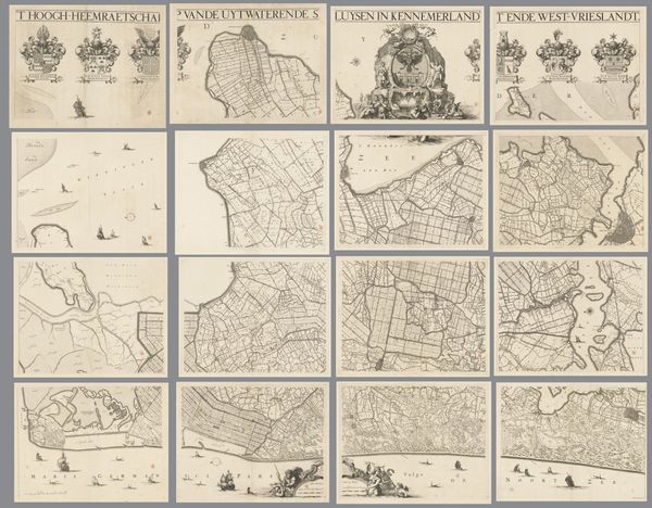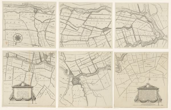 Here we see "Kaart van de provincie Utrecht, bestaande uit tien delen" by Thomas Doesburgh, a meticulously crafted map composed of ten sections. Notice the sepia tones, achieved through etching, which lend the piece a sense of historical depth and unity. The map's power lies in its intricate network of lines. They divide the landscape into a matrix of fields and waterways, demonstrating a structured view of spatial organization. The visual language here becomes a system of signs, each line and symbol contributing to a semiotic representation of the province. Consider how the map does more than just represent the landscape. Its formal structure—the careful arrangement of parts, the density of detail in certain areas versus the relative openness of others—creates its own form of knowledge. It invites us to consider how space is conceived, controlled, and communicated. This interplay between form and representation invites ongoing interpretation, challenging us to question how we perceive and interact with our environment.