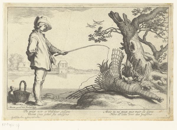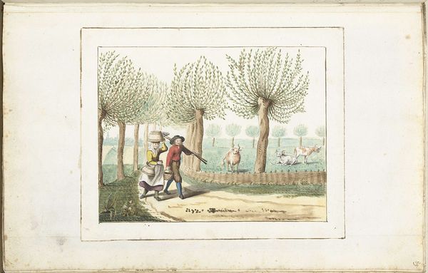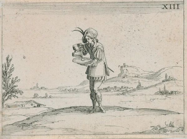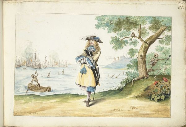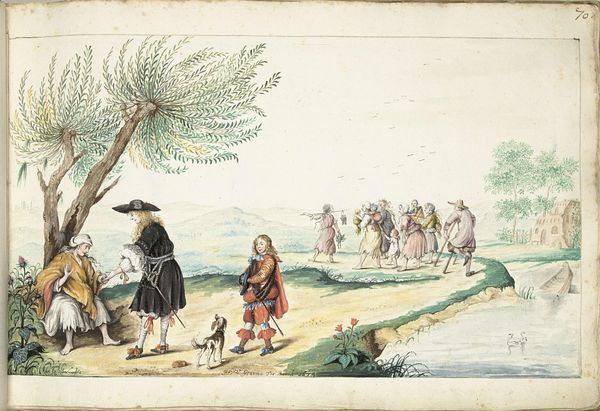 Curator: This watercolor painting, dating from about 1667 to 1670, presents Moses ter Borch in the countryside outside of Zwolle. I find it has this airy, almost dreamlike quality—how does it strike you? Editor: It reads like an advertisement, carefully constructed around labour, land and leisure. It shows him at ease near the family seat with the leisure to saunter around in fancy garments. The painting emphasizes wealth, literally representing this subject at rest with his dog who requires care, but can create nothing material on their own. Curator: Well, it certainly portrays an element of societal status, and those materials do communicate wealth, don't they? I get the sense that this image represents Moses not just as an individual, but also the persona he was trying to cultivate – refined and thoughtful. Editor: Yes, refined with the tools and toil of others. Even the materials, pigments mixed with painstaking effort, but I doubt he got his hands dirty. Curator: The painting itself is quite subtle – I love how the soft watercolors evoke the serene atmosphere. I imagine he had an affection for the pastoral scene, which might seem incongruous with what you mentioned. Editor: Not at all. It serves the same purpose, signaling a certain relationship with land and labor. This particular watercolor captures an interesting perspective; a kind of manufactured harmony. How was Zwolle known for it’s materials around that time, that may shine through the subject himself? Curator: Good point. Zwolle was emerging as a mercantile hub. I see a hint of quiet melancholy in his expression that, perhaps, betrays his thoughts on the whole production chain, or maybe a touch of existential boredom. It really comes down to the alchemy between the artist and the subject, I guess. Editor: Indeed, those materials—labor, landscape and capital. You put those under a glass and the magic disappears, doesn't it? Curator: Or perhaps a deeper kind of magic appears? Thank you for your analysis! Editor: And thank you, this was edifying.