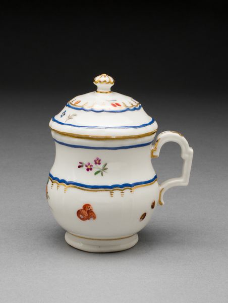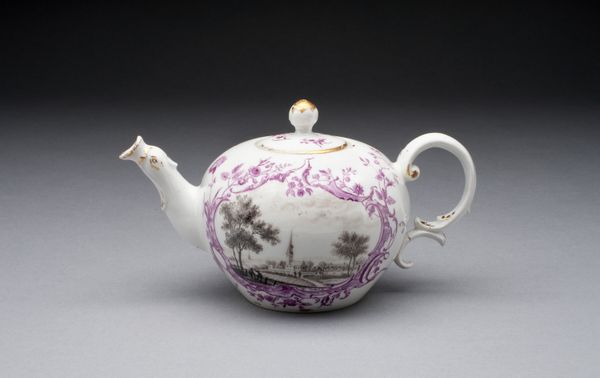 This teapot with peonies was made in Vienna using porcelain. The eye is immediately drawn to its round form, accentuated by a profusion of brightly coloured floral motifs. The organic shapes of the peonies contrast with the geometric precision of the teapot's structure. The arrangement of flowers across the surface isn't random; it follows the curvature of the teapot, enhancing its three-dimensionality. The artist employs colour to guide the eye, using bold reds and pinks against the stark white background to create a vibrant visual rhythm. The handle and spout, with their subtle curves, add a layer of complexity to the overall design. Consider how the visual elements intersect with the functional purpose of the object. Does the aesthetic design enhance or challenge our perception of this everyday item? Ultimately, the teapot becomes more than just a vessel; it's a space for artistic expression, inviting us to reconsider the intersection of art, utility, and cultural meaning.