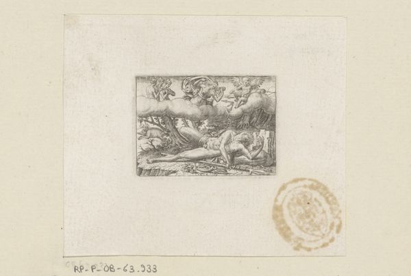 Editor: So, this is “Huwelijksaankondiging uit archief Philip Zilcken,” or "Wedding Announcement from the Philip Zilcken Archive." It’s an ink print, dating from before 1919, with this charming little cherub figure. It feels very decorative, almost like an illustration from a children's book. How do you interpret this work within its historical context? Curator: This piece offers a fascinating glimpse into the intersection of art and social ritual during the Art Nouveau period. The cherub, a symbol often associated with love and weddings, is rendered in a style that emphasizes decorative lines and organic forms. But it’s vital to consider how these seemingly innocuous images helped to solidify dominant societal norms. Editor: Could you elaborate on that? Curator: Absolutely. While visually appealing, consider what messages were implicitly conveyed through imagery of weddings. Marriage, especially at the time, was intrinsically linked to gender roles and expectations that served the patriarchal structure of society. These images normalised this institution. Do you notice anything particular in the style, technique, or even medium that might reflect larger social trends of the time? Editor: Well, the printmaking technique, allowing for mass production, would suggest a wide dissemination of these ideals, right? And the cherub, as a recurring classical figure, harkens back to accepted artistic styles and symbols. Curator: Exactly. The blend of classical and contemporary Art Nouveau styles underscores an effort to solidify established norms while appearing modern and aesthetically refined. We need to critically examine what appear to be beautiful images that promoted a specific vision of domesticity and societal expectations. Editor: This makes me look at the print with new eyes. Thanks for pointing that out. Curator: My pleasure! Art always reflects and shapes the society it exists within. Recognizing those complexities adds new dimensions to our understanding.