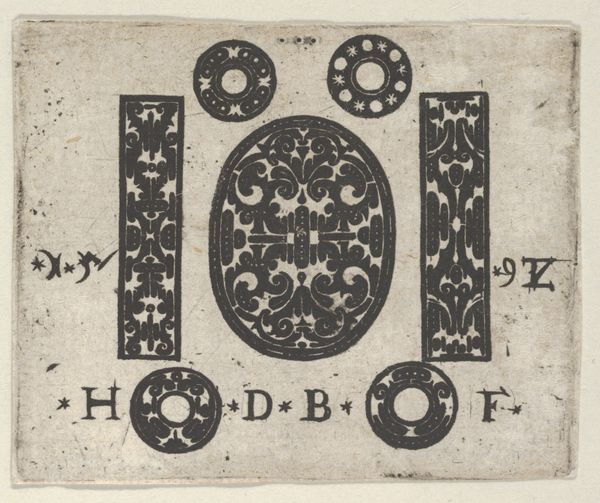 Curator: Let's take a look at a print dating back to 1592. It's called "Blackwork Print with a Horizontal Panel and Six Small Motifs" and is attributed to Hans de Bull. The work exemplifies intaglio and engraving, crafted with such meticulous detail. Editor: My first thought is just how ornamental and carefully constructed this piece is, given it's printed. There's such formality to the shapes. Is it jewelry, perhaps? Curator: That's a perceptive question. Prints like this were, in fact, used as pattern sources for artisans working with precious metals, embroiderers, and other craftspeople. They were disseminating styles throughout workshops. Editor: So the purpose wasn’t necessarily to create “art” in the way we think of it today, but rather to provide functional designs? The artist acting more as an engineer. Curator: Precisely. But of course, designs are never purely functional; they express symbolic weight, reflecting broader cultural values. The geometric and floral motifs seen here speak to a Renaissance interest in order and beauty but also a deeper tradition of symbolic meaning. Think of the fleur-de-lis, a potent signifier even then. Editor: Given that these forms likely end up in the hands of others, could this form of reproducible ornament have shaped the taste of an era or helped unify what objects, particularly personal adornments, looked like? Curator: Absolutely. Mass production and dissemination through print technology democratized access to stylish design, influencing taste and creating common visual languages across regions. The rise of a merchant class created both the technology and the consumers. Editor: Knowing that artisans relied on this to then produce luxury goods reveals an interesting system of labour, commerce and production. It's almost industrial! The work embodies a particular period in early capitalist modes of production. Curator: Well put. Thinking about the work as both an art object and a commodity is an important lens. These designs were essential ingredients for cultural production and its replication, spreading style throughout Europe and beyond. Editor: Seeing it this way has deepened my appreciation, understanding not just what’s shown, but how these things come into being. Thank you for clarifying how artisans once used this kind of imagery in the late 16th Century.