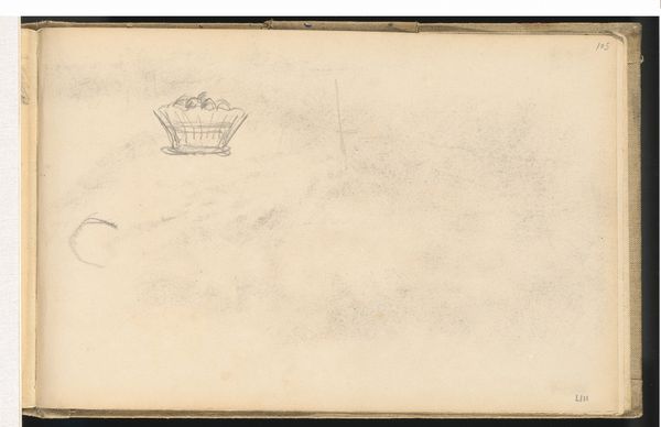 Curator: Right, let's dive in. Here we have a page from Frederic Leighton's "Sketch Book With Drawings on Twenty-six Leaves," dating from around 1850 to 1860. Predominantly pencil, a geometric figure on aged paper. What strikes you first? Editor: Solitude. A whisper on a vast, silent plane. It's like finding a forgotten thought, sketched then abandoned to the ages. Curator: The sketch itself, while simple, points to the academic training Leighton underwent. Pencil sketches were vital in learning techniques for transferring knowledge from geometry through architecture and, eventually, to rendering the human figure. It's all about the underdrawing— the infrastructure supporting representational art. Editor: That's interesting. And what an understatement. Academic, indeed! My eye wants to leap to narratives unrealized! The curve hints, perhaps, at vessels or foundations. I wonder why Leighton selected it and whether that was as dry an exercise as it appears to be on the page. It does seem...incomplete. Curator: Incompleteness, though, is part of its charm. Think about sketchbooks themselves as objects of production: often a record of daily labor, filled with experiments, studies, and sometimes complete drawings. For an artist trained in the mid-19th century, the sketchbook would be their laboratory and library, both resource and receptacle. Editor: A private universe—so many thoughts and feelings that could pour forth onto a canvas, but never did. The very grain of the paper beckons the mind's eye into it. I imagine running my finger over the paper’s edge, sensing what Leighton did. Curator: Indeed, Leighton would likely see this geometric figure as functional and purely that, a foundation on which he’d create some beautiful aesthetic structure. What he considered more crucial than it, though equally as functional. It is how one becomes masterful. Editor: What it lacks in grand gestures it speaks in undertones. I still sense secrets that can only come out in seeing them or in thinking about how they would serve as a way to create. Curator: An excellent insight—a testament to the unseen labor shaping artistic creation. Editor: Precisely. These pages are just hushed with what didn’t, but just could happen. What can emerge is for someone to realize!