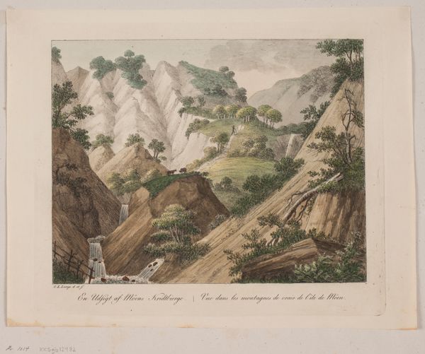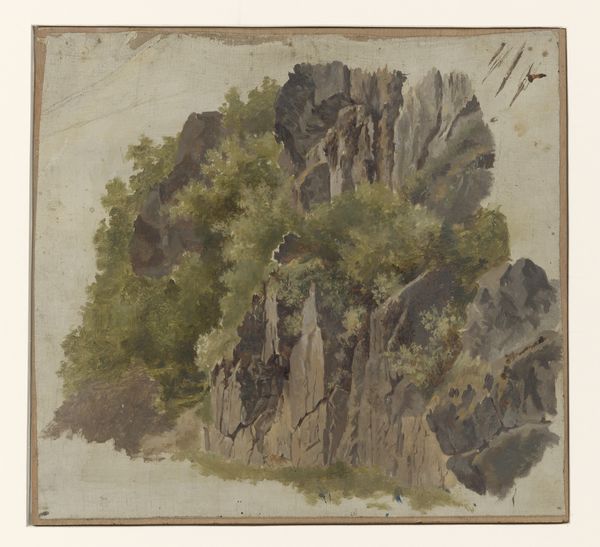 Curator: Before us is Johannes Tavenraat's "Rocks and Vegetation," a watercolor created around 1840, currently residing at the Rijksmuseum. Editor: It feels immediately… geological. I'm drawn to the textures, the way the watercolours mimic the rough surface of the rocks, and the cool palette evokes a sense of timelessness. It's almost monochromatic. Curator: It is a striking use of watercolour for representing landscape. Consider the social context: Tavenraat was working during a period where landscape painting was used to assert national identity, a form of visual inventory and celebration. But there is nothing grandiose here. Editor: No, it feels intimate, personal. It almost gives the rocks and vegetation a human presence. Look at how the cracks and crevices create what look like faces. I am wondering about its symbolic weight, what could the rock formations themselves suggest about resilience, the ability to endure. Curator: That's interesting because the choice of such a seemingly mundane subject avoids the typical Romantic heroic landscape. One could see this quiet realism as an emerging artistic trend, away from bombast and towards quiet contemplation of nature’s details. Perhaps the rise of scientific observation influenced artistic choices as well. Editor: Definitely, the vegetation is almost overflowing with a life of its own; notice the placement. Could this be about nature slowly reclaiming territory, almost an active process of regeneration, using those symbols within symbols, that idea that things do continue, nature does reclaim. Curator: What I find compelling is the interplay between objective observation and subjective feeling. While ostensibly a realistic study, the tight cropping of the image and limited color palette evoke an almost dreamlike quality, perhaps mirroring the changing social attitudes and values around industrialization during the 19th Century. Editor: I agree! The lack of human figures throws into focus the quiet power of raw nature. Reflecting on it, its visual narrative revolves around this endurance that can resonate at a deeply personal level for everyone. Curator: It is, in a quiet way, very striking. A subtle reminder that we are simply transient observers within a longer ecological and geological timeframe. Editor: Absolutely. I appreciate now how this quiet realism, amplified through careful symbols, manages to speak so loudly to us today.