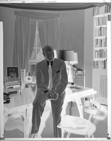 Editor: This photograph, simply titled "Untitled (man standing behind desk, smiling)" is by Peter James Studio. It's a small black and white print, but the composition feels quite formal. How do you interpret this work? Curator: The photograph uses inverse tones, which can symbolize hidden truths or an alternative perspective. The man, dressed in a suit, with a slight grin, seems to embody an approachable authority figure. What cultural narratives do you think this evokes? Editor: Maybe the contrast between the formal setting and the subtle smile represents a hidden complexity beneath the surface. It definitely feels like a commentary on power dynamics. Curator: Precisely. The inverse film adds another layer, inviting us to question appearances and look beyond initial impressions. Thank you for sharing your insights.