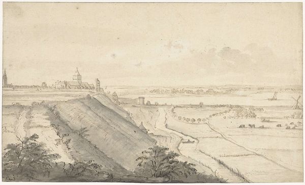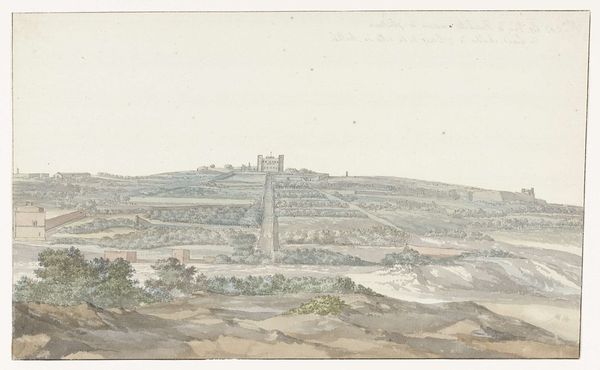Editor: So, here we have William Taverner’s "Town on a Hillside beyond a Valley." It’s a gentle watercolor wash that feels a bit… nostalgic? How do you interpret this work? Curator: Nostalgic is a perfect word! I feel a sort of serene detachment. It’s as if Taverner is painting a memory, softened by time. Do you notice how the town, despite being the focal point, seems almost like an apparition? Editor: Yes! It’s there, but also… not quite real? Curator: Exactly! It makes me wonder what Taverner wanted to convey. Was it a place he knew, or one he imagined? I get the sense it’s more about a feeling than a specific location. A lost Arcadia, perhaps? Editor: That's beautiful. I didn't consider that it might be imagined. It adds so much more depth to the scene. Curator: Art always surprises you, doesn't it?