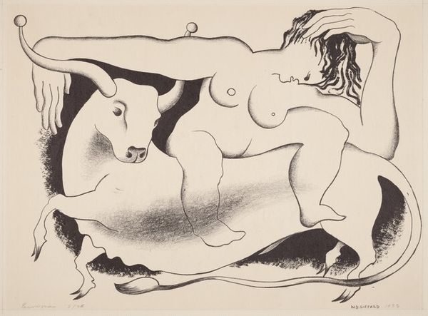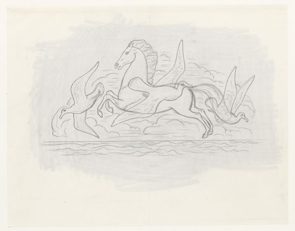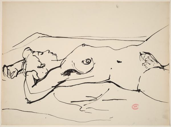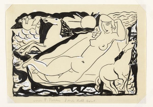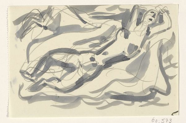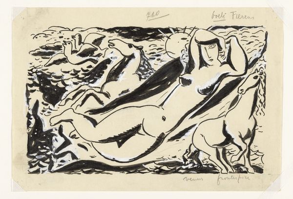 Editor: Here we have "Naakte vrouw en twee paarden in de zee" or "Naked Woman and Two Horses in the Sea," an ink drawing on paper by Leo Gestel, sometime between 1891 and 1941. It feels almost dreamlike... a woman reclining with horses, all rendered in these quick, bold strokes. How do you interpret this work? Curator: What strikes me is the ambiguity in the relationship between the woman and the horses. The woman’s nudity can be interpreted as a radical, rebellious form of freedom. During this period, the representation of the female nude was heavily loaded with patriarchal interpretations. Gestel seems to be pushing against that, suggesting an intimacy with nature, almost a sisterhood between the woman and these powerful animals. Does that resonate with you? Editor: Absolutely. The horses aren't just passively there; they seem alert, almost protective. So, you're saying this piece could be a statement about female empowerment through a connection to nature? Curator: Precisely. Consider the socio-political context; early 20th-century Europe witnessed burgeoning feminist movements. Artists were grappling with representing women outside traditional societal roles. This artwork invites us to dismantle preconceived notions of female vulnerability. What do you make of the fluidity of the lines, almost blurring the boundaries between bodies and landscape? Editor: I see what you mean. The bold lines create movement, like everything is flowing together. It’s almost as if the woman, the horses, and the sea are one single, interconnected being. Curator: Exactly. It speaks to a yearning for unity, rejecting rigid social structures and embracing a more fluid understanding of identity. I wonder, how might a contemporary audience react to the idea that the "natural" state is necessarily one of liberation, considering contemporary movements to reclaim and redefine natural identities? Editor: It’s definitely complex, but I think framing it within the historical and feminist context really illuminates its potential meanings. It really makes you consider how far we've come, and still need to go, in discussions around identity and representation. Curator: Indeed. Art offers a space for these critical dialogues.