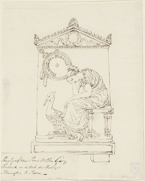 Curator: This delicate drawing, "Two Girls, One Seated, the Other Dressing her Hair," comes to us from a British School artist of the 19th century. It's a small work, just over 10 cm square. Editor: It's strikingly intimate. The sepia ink gives it a feeling of aged memory, like a glimpse into a private moment. Curator: Indeed. The act of hair dressing has been laden with significance cross-culturally. Here, it’s about intimacy and the rituals of feminine beauty. Note the downcast eyes of the seated woman, perhaps a symbol of introspection. Editor: And what about the material conditions of its creation? What sort of paper, the specific ink formula—these details shape the work. Curator: Precisely! The line work, achieved by that very ink on likely handmade paper, suggests a specific class, education, and access to materials. Editor: It speaks to the labor and the access to materials inherent in the artist’s station. I wonder what the artist intended for its consumption. Curator: I agree. The symbolism and materials both reflect the artist’s world. It's a powerful reminder of how much context is woven into even the simplest sketch. Editor: It invites contemplation on both its visual language and its tangible presence.