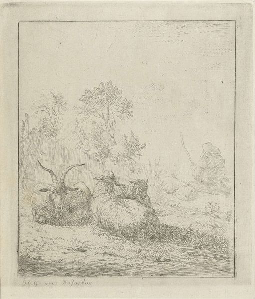 Editor: This is "Landschap met schaapherder en zijn kudde," or "Landscape with Shepherd and his Flock" by Pieter de Goeje, dating from between 1789 and 1859. It's an etching, rendered in delicate lines of sepia ink. It feels very pastoral, quite tranquil, but almost to a fault. It makes me wonder what the story here is... what do you see in it? Curator: Immediately, the strength of this work lies in its meticulous line work. De Goeje’s technique here invites contemplation on form. How would you describe the interplay between the shepherd, the sheep, and the landscape? Editor: I'm struck by how the landscape seems to echo the rounded forms of the sheep, while the shepherd is this very sharp, angular form on the other side. It creates this dichotomy between nature's softness and, I don't know, civilization's...sharpness? Is that reaching too far? Curator: Not at all. The opposition you noted serves as a visual device. Semiotically, we may decode the shepherd as the disruptor of nature's equilibrium or the agent who orders its elements. Notice, also, the almost monochrome palette. What effect does it produce, and what purpose does it serve? Editor: Well, it definitely flattens the image. It's not realistic, in that sense. But maybe the limited tonal range emphasizes the shapes themselves, their texture and their relations rather than the realistic colors of the land. It almost feels… conceptual? Curator: Precisely. De Goeje subverts a purely representational reading, privileging formal relationships within the composition. The material, etching, inherently emphasizes the graphic structure. Note the relationship between foreground and background. Do the hill or mountain appear distant? Editor: No, they're rendered with the same sharpness of line, but are much less focused-on than the Sheep and Shepard in the very front. That equal weight almost undermines any sense of spatial depth. The interplay you are showing me here is really well put together! Curator: Indeed. The artwork challenges conventional perspective. The material qualities are not divorced from content; it makes you realize that line can represent any boundary to thought as a limitation of our gaze on things, if the lines in this plate have a will to see or not to see certain things. The artist chose an important technique. Editor: I never thought of it that way. So it's less about representing reality and more about exploring form and line itself? I'll keep that in mind next time.