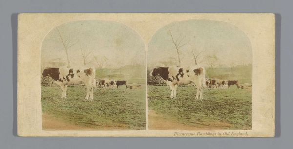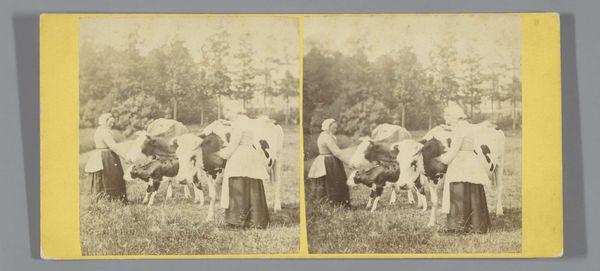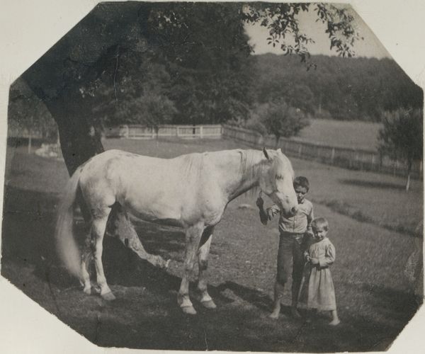 Curator: Allow me to introduce Underwood & Underwood’s photography work entitled "A little Child Shall Lead them!" captured in 1901. What's your immediate response? Editor: Well, it strikes me as surreal. You've got this wee girl posed with, what, a prize-winning bull and a fluffy sheep, all set against a pastoral backdrop. It’s a whimsical concoction. There's a sense of idyllic naivety about the piece. Curator: Precisely. The composition places the child at the center, literally and symbolically leading these powerful, yet traditionally docile, creatures. Structurally, the size disparity between the girl and the animals creates a visual tension that commands attention. Editor: Indeed. And I find the soft sepia tones add to that feeling of nostalgia and gentle innocence. The contrast between the animals' imposing physical forms and the girl's serene presence invites deeper questions, like, where exactly are they going? What’s the intent here, what is being signified? Is it symbolic of the peaceful kingdom, or perhaps humanity’s ability to tame even the wildest beasts? Curator: Interesting points. Note the subtle realism of the landscape against the carefully arranged group; this could certainly serve as commentary on power and docility in societal frameworks. Underwood & Underwood utilizes photography here to invite contemplation. Editor: Exactly, but not in an overtly serious way, you know? There's almost a gentle irony in the presentation; a sweetness that keeps the work engaging. And while it has these complex thematic layers, there's something innately charming about the innocence presented, regardless of interpretation. The girl has this disarming composure, unbothered and confident, which lends a sort of playful challenge to the overall feeling of control. Curator: Agreed. Ultimately, the photograph is both a reflection on and an idealistic aspiration toward peace and guidance through what's perhaps purest about us, capturing something thought-provoking in that. Editor: Makes you wonder where we've wandered off since then. Anyway, I suppose even art from 1901 still holds a few essential mirrors up for us to peek at today. It may very well invite hope and innocence towards more peaceful guidance even now.