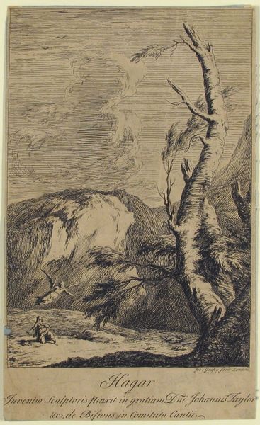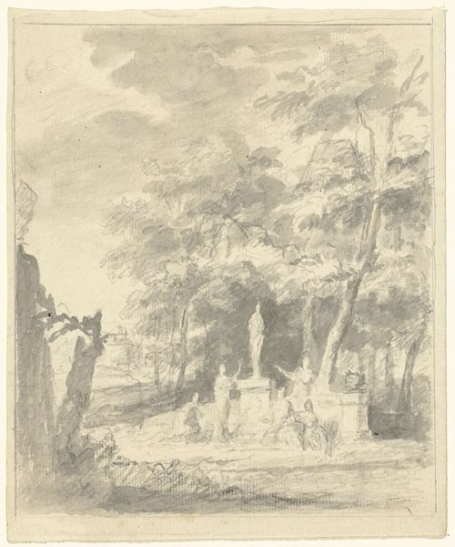 Curator: This is “Brug met standbeeld,” which roughly translates to “Bridge with Statue." It's an etching likely made with ink, and although the dating is broad, the artwork hails from somewhere between 1796 and 1856. Editor: There’s something melancholic about this little scene. The lines are so fine, almost like a memory fading. And the composition – a solitary statue overlooking a modest bridge, a ruined building. It has a poignant feeling. Curator: Notice the texture created by the etching. The artist, Reinierus Albertus Ludovicus baron van Isendoorn à Blois, uses varied line weights to depict light and shadow, and there is remarkable tonal depth achieved here with the limited means. This piece reveals a detailed, studied process of printmaking. Editor: The statue immediately brings to mind classical sculpture motifs – the idealized human form, even in this somewhat crude rendition. I see a protective figure there, a sort of guardian, placed at this pivotal crossing. There are echoes of religious iconography, perhaps a saint or Madonna. Curator: It's interesting to consider the consumption of prints like these. This would have been relatively accessible art, perhaps collected and kept in albums. It's a step away from unique artworks created for a privileged class, reaching a wider audience and shaping taste through reproduction. Editor: True. And thinking of that audience, consider the cultural landscape in which they encountered such images. Bridges are passages, transitions; and that ruin evokes nostalgia, perhaps a lament for a past that existed more strongly in art than it did in the current lived world of the time. Curator: A lot of romantic landscape artists at the time were trying to manufacture scenes of beauty in a Europe experiencing intense urban industrial growth. It’s striking how labor is not obviously present within the landscape—we are presented with a scene that foregrounds consumption, not production. Editor: In many ways it evokes the fragility of human presence within the natural world. Both bridge and castle represent ambition. Yet the scene implies time might wash them all away. Thank you for this subtle encounter, focusing on a range of suggestive cultural symbols. Curator: And thank you. Thinking of it materially emphasizes that artistic ideas often exist in parallel with specific tools, materials, and methods available to artists at any given moment in time.