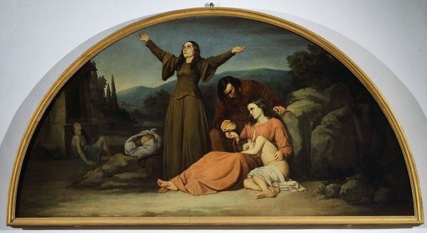 Editor: Here we have Józef Simmler's 1864 oil painting, "Sketch to the Painting ‘Three Marys Walking to Christ’s Tomb’." There's such a feeling of somber movement, like they're carrying grief itself as they traverse this landscape. What story do you think this sketch tells through its symbolism? Curator: It is a study, indeed, heavy with symbols of mourning and perhaps dawning hope. Look at the positioning of the figures. Their downward gaze, the obscured faces – they all point to a collective grief. Yet, the landscape is not barren. Notice that even in their sorrow, there's a suggestion of rebirth: faint signs of new growth, the presence of dawn... Could this be indicative of resilience? Editor: Yes, the almost imperceptible light does give a sense of something beyond the immediate sadness. The oil paint adds texture too, and gives each figure so much weight, anchoring them to this earthly space. The crosses on the hilltop further ground the painting's narrative to Christian history and art tradition. How does that imagery contribute? Curator: The crosses definitely solidify the narrative. But notice, also, the almost ghostly rendering. Simmler masterfully uses that slight blur to denote the spiritual dimension. This blend suggests not just memory, but a cultural echo—of repeated loss and hope, ingrained in our very perception. Editor: So it’s about the enduring emotional resonance, reflected through historical and visual cues? It's interesting how one image holds so much history. Curator: Precisely. Simmler has given us access to layers of memory—both personal and collective. That sketch transcends a mere historical painting, revealing deeper symbolic dimensions of shared human experience.