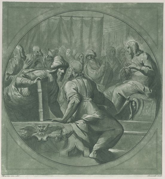 Editor: This is Januarius Zick's "Enthauptung Johannes des Täufers," or "Beheading of John the Baptist," a drawing made around 1755 with ink and gouache on paper. It's rather grim, naturally. All the figures seem caught in this terrible moment. What do you see in terms of its history? Curator: The image, steeped in the visual language of the Baroque, reflects a recurring fascination within religious and political spheres with power, sacrifice, and martyrdom. It depicts a specific biblical narrative but it also speaks to broader concerns regarding authority and its often brutal exercise. The use of the grisaille technique—executed solely in shades of gray—invokes a somber mood appropriate to the subject. What kind of a public impact would art such as this have during the 18th century? Editor: I guess in a society where religion was much more central to everyday life, it would be a potent reminder of religious and moral expectations, or maybe warnings. Do you think that explains its popularity at the time? Curator: Exactly. Religious works like this, particularly those displayed in public spaces like churches or even reproduced as prints, served as visual tools for moral instruction, reinforcing social norms and power structures. The graphic nature of the beheading forces the viewer to confront uncomfortable truths about justice, faith, and obedience, further emphasizing the didactic function. And the patron of the piece, as well as the display context, shapes how these ideas are presented. How might its message change in a different time? Editor: That’s interesting to consider. Nowadays, in a museum, it’s more of a historical artifact and the message is somewhat diminished but allows us to look back critically at that time. Thanks, that clarifies a lot! Curator: And seeing it this way encourages questions, making art from the past relevant today.