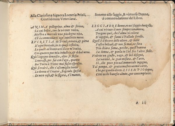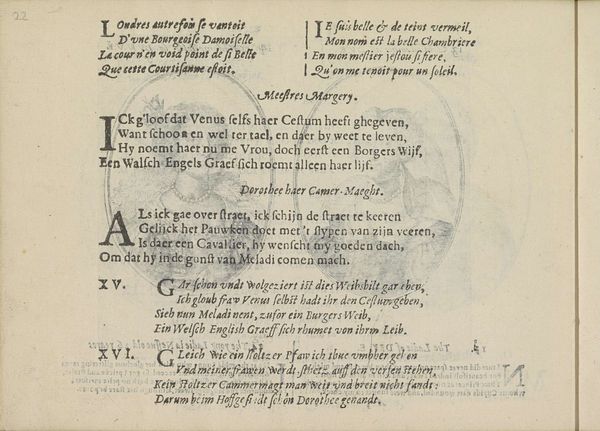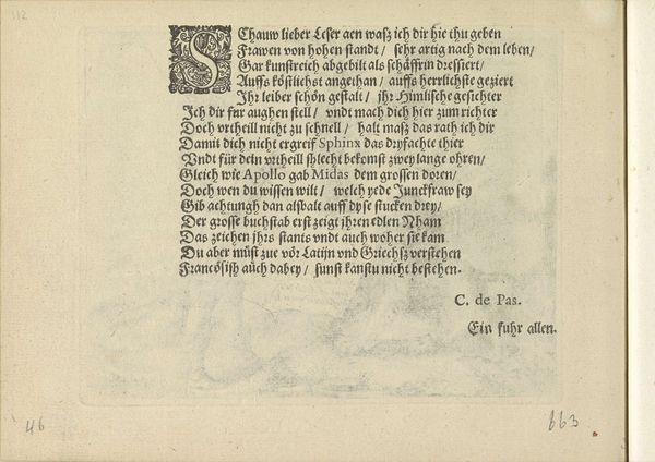 Curator: Johann Sibmacher created this page, "Schön Neues Modelbuch (Page 4 verso)", in 1597. It combines print, drawing, and calligraphy in ink and watercolors on paper, held now in the Metropolitan Museum of Art. It's striking, isn't it? Editor: Immediately, I'm drawn to the contrast between the crisp blackletter text and the more organic, hand-drawn border. You get this sense of formality contained, or even challenged, by something much more free-flowing and decorative. The paper itself looks well-worn, too – aged through use and handling. Curator: Modelbücher, or model books, like this one, were incredibly important for disseminating patterns, especially for needlework and lacemaking. The text actually relates to adornment and virtue, which were obviously very symbolically intertwined during the Northern Renaissance. Editor: It speaks to the rise of a certain kind of labor, too, right? I mean, lacemaking wasn't just decorative, it became an economic force. Books like these democratized access to increasingly intricate and specialized design patterns; craftspeople could reference these models and execute these designs in their own workshops or homes, and a system for distribution of labor could become even more widespread. Curator: Absolutely. And consider the act of copying. Each artisan imbues the pattern with their own skill and interpretation, carrying a piece of cultural knowledge forward, echoing earlier iterations, making it subtly their own. Editor: It reminds us that even within prescribed artistic boundaries, there's always room for material expression and adaptation. You mentioned virtue; I can’t help but notice a red watermark visible in one corner. That little addition alone quietly contradicts the notion of strict, Protestantical obedience. Curator: A fantastic observation! That emblem acts as a visual echo chamber, linking this seemingly straightforward craft manual to broader questions of moral behavior and, ultimately, the artistic freedom afforded through knowledge and skill. Editor: It shifts how I perceive even the floral border— suddenly each looping, swirling form represents an artisan’s choice to personalize the overall design and the virtue of innovation. These objects give insight into material economies, as well as patterns of taste. Curator: So much to glean from one page. These kinds of symbolic echoes are what makes it endlessly fascinating. Editor: Indeed, something so ostensibly simple really reveals layers of labor and lasting creative adaptation, centuries onward.