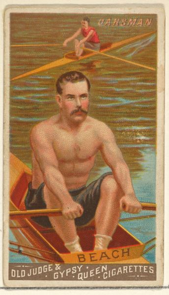 Curator: Look at this portrait. It’s "Albert Hamm, Oarsman," from the World's Champions series created around 1887 by Allen & Ginter, initially distributed as collectable cards with their cigarettes. The medium here seems to blend drawing and printing, with both pencil and coloured pencil adding their delicate touch. What’s your initial take on it? Editor: There's something endearingly old-fashioned about it, almost wistful. It’s more illustration than pure portraiture; the colors are soft, and there's a sweetness, a rosy-cheeked ideal of athleticism, that feels very particular to the era. Curator: Precisely. And the symbolism works on multiple levels. Water often represents purification or the subconscious. An oarsman confronts it head-on. In the late 19th century, with burgeoning industrialisation, sporting heroes evoked notions of a healthy physique and wholesome dedication—antithetical to urban decay. Editor: Absolutely, that push for physical culture. The striped shirt alone speaks to a certain kind of masculine display that’s both playful and a bit theatrical. It’s fascinating how such a simple image can evoke an entire cultural moment. Note the miniature of the man rowing as if emerging from behind his head. Curator: Ah yes, in the composition, that tiny figure is compelling— almost like an ego figure behind the "true" self in the foreground, performing out on the water while the headshot captures Hamm's outward facing public image. It's quite Freudian now that you point it out! Editor: It's more than advertising; these cards embedded social ideals, packaging them with a nicotine fix. We tend to forget, visual cues—the mustache, the cropped hair, all spoke volumes about masculinity. The pose almost becomes a kind of symbolic action itself. Curator: Right, the symbols were part of shaping the ideals it tried to embody! It makes one wonder if Hamm really ever gazed this idealised. We see how image construction plays with reality even back then. This card, while simple, gives a complex commentary about sports, body and advertising culture. Editor: Definitely, and unpacking all of that embedded meaning is more than just history—it illuminates how we still perform ideas today, using images to tell a story, true or not. A little treasure about identity packaged with cigarettes!