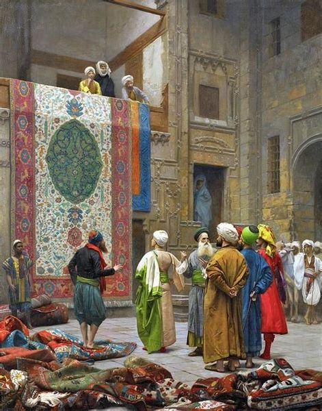 John Frederick Lewis painted "The Bezestein Bazaar of El Khan Khalil, Cairo," capturing the intricate dance of daily life. The bazaar, a space of vibrant commerce and social exchange, pulses with a life that extends far beyond mere trade. Note the clothing: turbans, flowing robes, and slippers scattered about. These are not just garments; they are symbols of status, identity, and belonging, each thread telling a story of its wearer’s place in this intricate social tapestry. Consider the leisurely postures, the men reclining, smoking hookahs, and engaging in animated conversation. This is a scene reminiscent of ancient forums and agoras, spaces where ideas are exchanged as freely as goods. The image reminds me of similar scenes in Renaissance paintings, where merchants gather in marketplaces, their gestures and interactions revealing the economic and social currents of their time. These depictions across cultures reveal a continuous thread of human interaction, a collective memory of trade and exchange that shapes our social fabric. This bazaar, like those ancient markets, becomes a stage where human dramas unfold, forever echoing through the corridors of time.