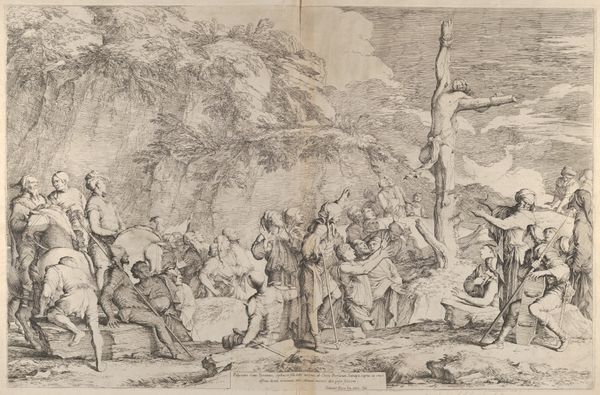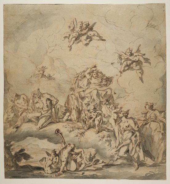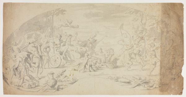 Editor: This is "Moses and the Chosen People Behold the Drowning of the Egyptian Army in the Red Sea" created between 1627 and 1703 by Domenico Piola, it’s an ink and charcoal drawing on toned paper. I am struck by the monochromatic color, it almost makes the tragic event look peaceful, maybe even serene? How would you interpret this work? Curator: This piece raises some fascinating questions about artistic production and labor in the Baroque period. We see the final product, a beautiful drawing rendered in ink and charcoal. But what about the paper itself? Was it manufactured locally or imported? And who prepared the toned ground? Each step involved human labor, skill, and materials sourced from specific locales. Editor: So you are saying the final image on paper is the very last step of a long process, influenced by many other aspects beyond artistic expression? Curator: Precisely! Even the act of choosing these materials over others - say, a fresco on a palace wall versus a drawing for a private collection – reflects socio-economic factors. What impact would those factors have on a viewer during the Baroque period versus a modern one viewing the artwork now in the MET? How does knowing where that charcoal originated influence our understanding? Editor: It's like tracing the artwork back through layers of creation, involving not just the artist's hand, but a network of laborers and global trade routes. I hadn't considered the toned paper as a deliberate, manufactured choice that is influencing my own interpretation. Curator: Right. Think of it, we're looking at a moment of salvation, a key story of the Bible, filtered through the lens of Domenico Piola, yes, but also through a complex web of materials and making. Editor: Thank you for pointing out the materials. It really changes the way one thinks about "creation" and puts my interpretation into perspective.