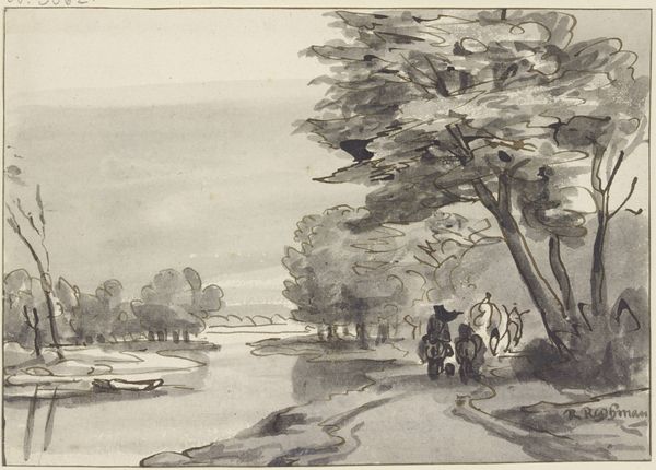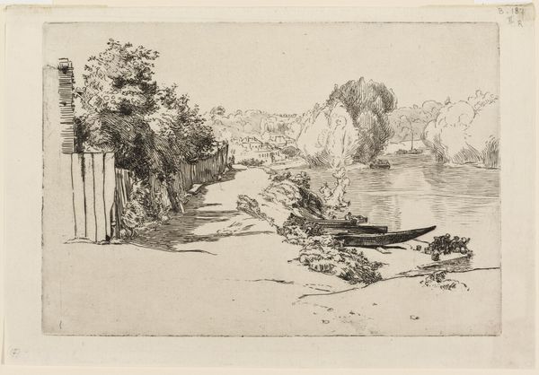 Félix Bracquemond created this print, La Seine au Bas-Meudon, using etching. The composition here directs us from the foreground to the background, with a path flanked by a fence on the left and the riverbank on the right. Bracquemond's strategic use of line and tone creates depth, particularly in the rendering of foliage and water. The textures vary across the print, from the rough-hewn fence to the smooth surface of the river. The etching technique itself invites us to consider the print as a constructed image, a series of deliberate marks that come together to form a coherent view. This relates to a broader artistic concern in the late 19th century with the process of representation. Bracquemond seems less interested in illusionism and more focused on the act of seeing itself. Note how Bracquemond uses the horizon line to create a sense of receding space, a technique that subtly destabilizes the viewer's sense of perspective. This artwork is not just a depiction of a landscape, but an exploration of how we perceive and interpret the world around us.