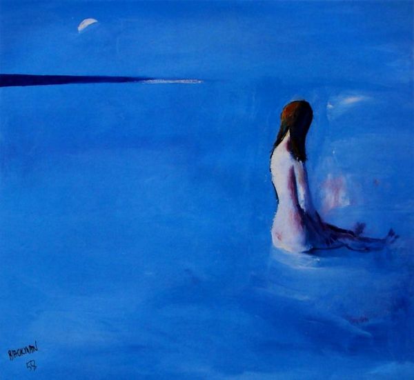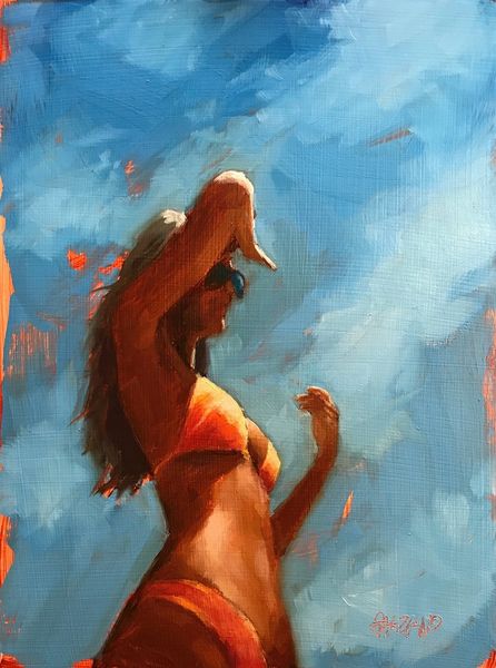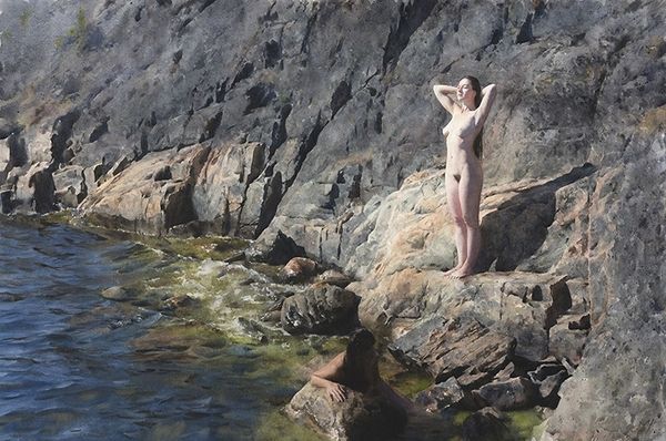 Editor: So this is "Buongiorno" by Vicente Romero, done with oil paint. The painting has such a light, airy feeling. What do you make of it? Curator: Well, isn't it a poem? A visual whisper of a perfect morning. I see the artist capturing not just a scene, but a sensation—the cool water, the gentle breeze, the silkiness of the shawl almost tickling the skin. It’s as if he's bottling up a memory. Doesn’t it make you want to dive right in? What strikes *you* most? Editor: It's the shawl, definitely. It brings this wonderful burst of energy to the whole piece, while the water itself is so still. Curator: Exactly! That shawl is almost alive, isn't it? A splash of joy, against the serene backdrop. Romero's use of light is remarkable; he creates this luminous atmosphere that practically vibrates. I always imagine what stories are hidden in the light- the untold tales of that seashore... Have you ever felt that somewhere calls you to the deep and unexplored regions of yourself? Editor: Not in that exact way, but I can feel the potential! So you see the painting as more than just an image, but a story? Curator: Oh, absolutely! For me, art is never *just* an image. It’s a portal, an invitation to daydream, to ponder, to *feel*. It shows how transient moments like this become little seeds of the inner self. "Buongiorno" encapsulates the awakening of a spirit—wouldn’t you agree? Editor: I do now. Thanks, that’s a completely new way to look at it. Curator: My pleasure! And thank you— you helped me see new glimmers in it as well!