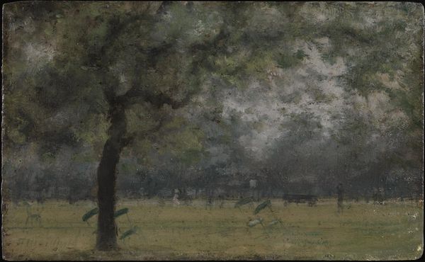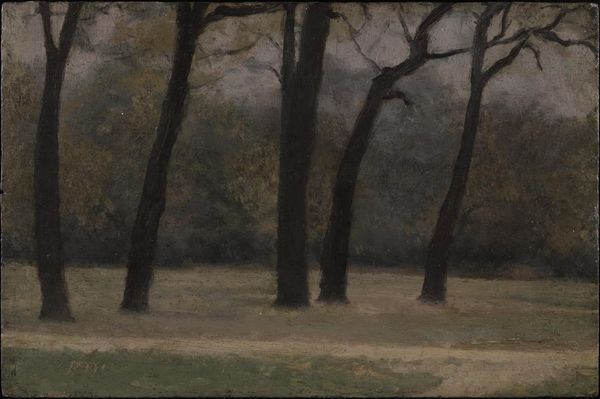 Editor: This is Hryhorii Havrylenko's "Landscape" from 1971, an oil painting. I am immediately struck by how muted the colours are. The brushstrokes seem deliberate, almost mechanical. How does this adherence to the real affect your perception of it? Curator: The flatness of colour and texture speaks to the industrialized agriculture common in the Soviet Union at the time. Notice how the trees are presented almost as mere components in a wider, economically-motivated configuration. Editor: Do you mean the landscape feels…productive, or about the industrial production itself? It seems barren. Curator: Precisely! It’s about both production and the consequence of it. The repetitive brushstrokes might be seen to represent a relentless, almost soul-less labor process imposed on rural populations during that era. The bareness might hint at the depletion of resources under centralized control. Does that perspective resonate with you? Editor: Yes, thinking about it in terms of production really changes how I see the muted colours now, a depiction of depleted land due to Soviet industrialization. Curator: It’s fascinating to consider the labor and socio-political conditions mirrored by the materiality of paint itself, wouldn’t you agree? Editor: Absolutely. It makes the act of painting more complex and political than I first considered. It encourages me to rethink artistic interpretation through societal processes.