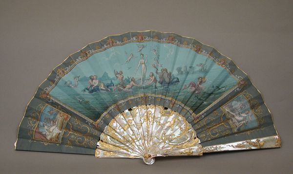 Editor: Here we have an elegant folding fan from around 1780-1795. It seems the artwork is tempera on, I presume, paper or vellum. It depicts a scene with figures and harvest imagery, but its delicacy belies its functional purpose. What do you make of this decorative object? Curator: Well, beyond the delicate aesthetic, consider the social context. Fans like these were integral to 18th-century social rituals. It was a means of production inseparable from the societal elite. Each painted scene became a carefully considered performance between owner and viewer. The fan isn’t just a pretty object; it's labor, status, and even covert communication condensed. What story is this object telling, outside the obvious biblical reference? Editor: It feels a bit subversive, if I’m understanding correctly. The image itself feels almost secondary to the fan as a tool, as a medium of cultural production. So the image of Ruth and Boaz... it's less about the biblical narrative and more about the display of wealth, material, and a specific identity, right? Curator: Precisely! Look closely at the materials – ivory, tempera, paper. Each required specialized labour, from sourcing to production. And the choice of the Ruth and Boaz narrative is itself interesting – perhaps hinting at ideals of charity, but consumed within a framework of luxury and conspicuous consumption. How does the method by which these materials were combined shape the viewer's interpretation? Editor: It definitely reframes it for me. The combination of fine materials, biblical subject matter, and, really, the physical work put into its production really clashes. I now see how interwoven this object is within that social moment. Curator: Exactly. Analyzing art like this fan is about dismantling those boundaries and revealing the intricate relationships between making, meaning, and power. I appreciate how your insight and observations allowed us to reveal an unseen history behind this object. Editor: Absolutely! Thanks so much for helping me understand all these elements today! I'll never see fans the same way.