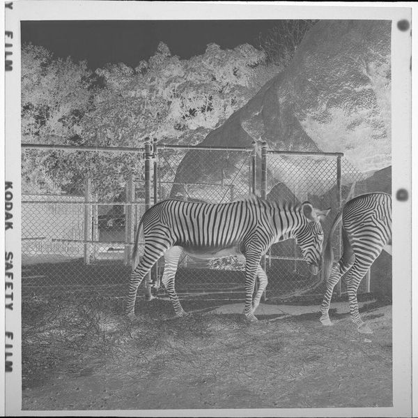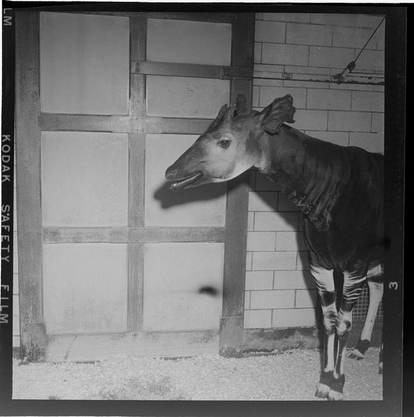Curator: This is an untitled photograph by Jack Gould, part of the Harvard Art Museums collection. It depicts an animal in a cage at a zoo. It’s quite small, only about 6 by 24 centimeters. Editor: My first thought? Melancholy. The starkness of the black and white, the bars, that slightly dejected-looking okapi. It’s a visual poem about confinement. Curator: The okapi itself is fascinating, a creature of mythic quality with those zebra-like stripes on its legs. It’s a powerful symbol of nature held captive, a poignant reminder of our relationship with the wild. Editor: Absolutely, and the composition emphasizes that. The zoo worker is also in the photo but he does not engage with the okapi. The bars are a constant visual echo of restriction. Curator: It really makes you think about what we project onto animals, doesn't it? The zoo setting, a kind of modern-day ark, and the expectations of human observation. Editor: The image certainly stirs up complex emotions. It is simultaneously beautiful and heartbreaking. This image of this creature, an okapi, in confinement is not easily forgotten.