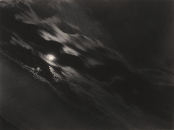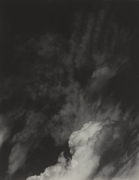 Curator: Here we have Alfred Stieglitz's "Equivalent," a gelatin-silver print from 1927. Editor: Oh, moody! At first glance, it feels like a brooding sky, all turbulence and shadowed emotion caught in monochrome. Like a whispered secret of nature. Curator: Stieglitz, after turning away from portraits, was focused on capturing clouds as representations of his inner states. What interests me is how photography, then seen as a tool for documentation, becomes here a means of abstracting subjective experience. The making of these prints, and the choices Stieglitz made in the darkroom were an integral element for how the finished photograph finally was made, and ultimately received as an object. Editor: So, it’s less about accurately portraying a landscape and more about...transmuting feeling into form. I love that. You know, looking closer, I see tiny geometric shapes, the clouds have become abstract building blocks, which adds to that sensation of… elemental struggle. Curator: Right, consider also that Stieglitz, moving away from straight photography towards pictorialism and abstract expressionism, questioned the definition of art through the then nascent medium of photography, emphasizing its potential to be as expressive as painting. The print itself, as an artifact of its time, shows how an early photographic process can convey these deeply expressive capabilities. Editor: And I get that it's pushing boundaries. It makes you consider what "landscape" can really mean when it is so intimately intertwined with emotional output. The image is not about capturing, but creating, a mood, which reflects how feelings, thoughts, and processes all create form. I imagine that it also felt particularly modern at the time. Curator: Precisely. The rise of skyscrapers, mechanization, all happening alongside movements in abstract painting contributed towards new understandings of space and form, especially as linked to individual experience of this modernity. The labor and resources going into new urban environments was both mirrored and pushed against by artwork. Editor: Seeing how his art touches on something eternal even when tied to a particular point in time helps bring me back to Earth. I mean, back to clouds! To really notice them above our heads. Thanks for pulling back some clouds and showing us how it does this. Curator: Likewise, looking at this, and then outwards is to experience it anew in this discussion and afterwards. That process alone might shift it into an equivalent all its own.