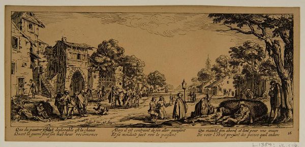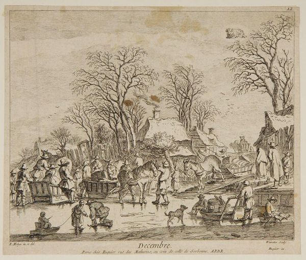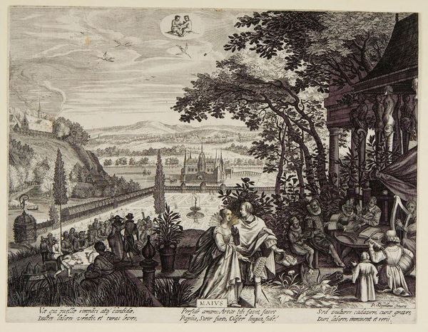 Curator: This image, titled "October," was created by Aegidius Sadeler II. It's an engraving, and what strikes me immediately is the overwhelming feeling of industry and abundance; everyone is caught up in activity. Editor: Absolutely, the composition overflows with figures and objects. The astrological symbol of Scorpio hovers above, a potent symbol that underscores the transformative and sometimes secretive nature of October's harvest. Curator: Yes, Scorpio rules the depths, both literal and metaphorical. This harvest scene, heavy with grapes and figures pressing juice, becomes more than just a depiction of agricultural work. It is a cultural touchstone. It speaks to communal effort. Editor: The vineyard seems to stretch toward that distant town. The piece gives us a specific place and time, doesn’t it? How the community and the cosmos align for the seasonal work. Curator: Precisely, it's a symbolic convergence. Considering the print's time, I think we can assume that Sadeler was using images to speak to the social order of his time. Editor: It is remarkable how much visual information is packed into such a relatively small plate. The image lingers in the mind's eye.
