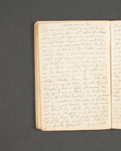 Curator: This pen drawing on paper is titled "Rejsedagbog. Amsterdam," which translates to "Travel Journal. Amsterdam." It was created by Johan Thomas Lundbye in 1846 and now resides in the Statens Museum for Kunst. Editor: It looks like an intimate glimpse into the artist's private thoughts, almost like peering over their shoulder as they jot down observations. There’s a certain quiet intensity to the scrawled script. Curator: Absolutely. As a travel journal, the miniature serves as a portable repository of experiences. In the Romantic era, the sketchbook evolved into more than just preliminary studies; it was seen as a space for capturing the immediate sensations of travel and reflection. The hurried writing conveys the sense of fleeting time. Editor: Do we know more about why Lundbye was in Amsterdam? How might understanding the journey contextualize the marks made here? Are there social and political undertones shaping what is included, what is omitted from this personal document? Curator: Sadly, the page exhibited from this sketch book is missing accompanying imagery, which makes finding answers challenging. However, Lundbye, a Romantic painter, frequently worked with themes of nature and the sublime, connecting to feelings, memory and the symbolism of personal experience. Text becomes as equally important as a picture in recording observations of travel. It suggests not just what he saw, but what moved him, what he sought to understand. The handwritten nature becomes like a code to break, it gives unique insight. Editor: That act of recording, the labor of writing, especially at that time, was often a highly gendered activity. Were journals primarily a space for white European male introspection? This glimpse into Lundbye's journal prompts so many other questions of access, and I wonder whose voices, literally or figuratively, are excluded from this “personal” historical record? How do broader structures shape intimate thoughts, the choice of detail, and the nature of looking? Curator: Those questions are vital. By the 19th century, written languages acted as visible forms and signs, embodying an almost divine nature, and this miniature page reveals what Roland Barthes defined as “the pleasure of the text.” Editor: Definitely. The scale invites us into that sense of personal pleasure. Looking closer, I am touched by the labor and dedication the writing conveys. I value the opportunity this provides, opening doors into a particular life, in a particular moment, with such distinct sensitivity. Curator: It is truly an honour to reflect together, adding new layers of appreciation.