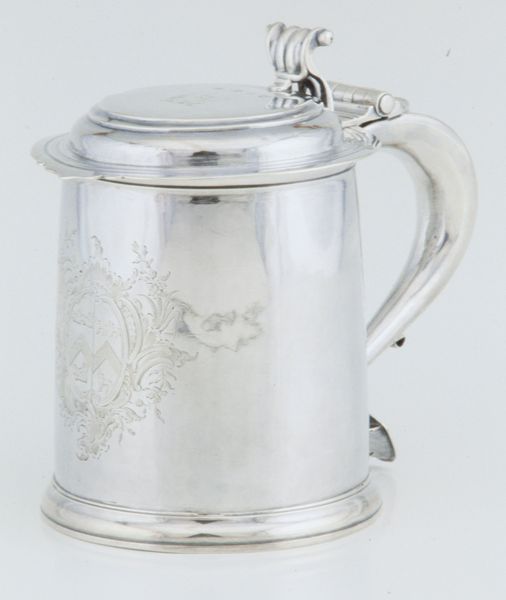 This silver tankard was crafted in London by V.C. sometime between 1680 and 1695. The coat of arms prominently displayed is not merely decorative; it's a potent symbol of identity and lineage. Its presence evokes an immediate connection to the noble families of the time and echoes heraldic traditions found across Europe, even reminiscent of the elaborate family crests adorning Renaissance palaces. Think of the Medicis in Florence, where such symbols were not just markers of identity but tools of power, declaring status and heritage. The lion rampant atop the shield is not unique to this family, of course. The lion, courage, nobility—these associations stretch back to ancient Mesopotamia, appearing in royal iconography across millennia. The resurgence and adaptation of such symbols reveal our ongoing need to connect with the past, to root ourselves in a history that, while ever-changing, remains a powerful force in our collective psyche.