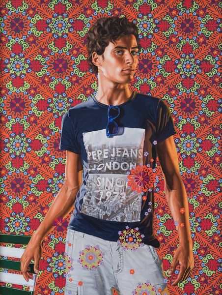 Curator: Kehinde Wiley's 2011 acrylic painting, "Alios Itzhak", is a striking example of his fusion of contemporary portraiture with historical artistic traditions. What’s your first impression? Editor: I’m immediately drawn to the juxtaposition—the casual attire of the subject against the highly ornate, almost Byzantine-like backdrop. The contrast is so arresting; it’s both regal and relatable, somehow. Curator: Absolutely. Wiley is known for placing contemporary Black men in poses and settings traditionally reserved for European aristocracy. It raises interesting questions about power, representation, and the construction of identity. What do you see in the background imagery? Editor: It's a dense tapestry of symbolism! The lions flanking the central figure suggest strength and dominion, classic heraldic motifs. But interwoven with birds, vegetation…almost an Eden-like quality alongside the strong symbols of the zodiac. Is there a connection here? Is the subject meant to stand as a personification of certain strengths like Leo, or even something related to Judaica in reference to Itzhak? Curator: That's precisely the kind of cultural layering Wiley encourages. The floral patterns act almost like a visual echo of the subject's own "ornamentation"—notice the swirling motifs on his t-shirt and arms. The use of gold tendrils as symbolic ties between his clothing and his position in space within the history of image building and "great art." Editor: And those blues, a vibrant cobalt recurring both in the patterned background and Alios' t-shirt--the symbol of devotion! Curator: It's all carefully calibrated, isn't it? Wiley isn’t just creating a portrait; he's crafting a statement about visibility and reimagining art history's power structures, and of a different ideal within current urban landscapes. It's a powerful conversation starter. Editor: It makes you consider the very act of looking – who gets to be seen, and how? The symbolic weight in the painting invites us to unpack a lot of assumptions. Thanks to how clearly it stands against past ideals. Curator: I agree, this piece urges us to challenge existing artistic canons while prompting critical engagement with enduring symbols. Editor: Ultimately, “Alios Itzhak" resonates because it reframes what it means to inhabit positions of historical power and to examine a reframed popular visibility.