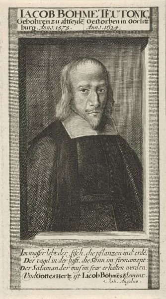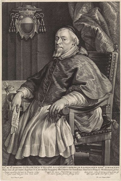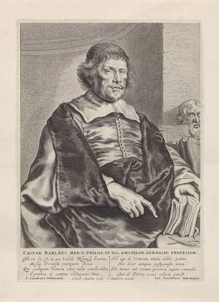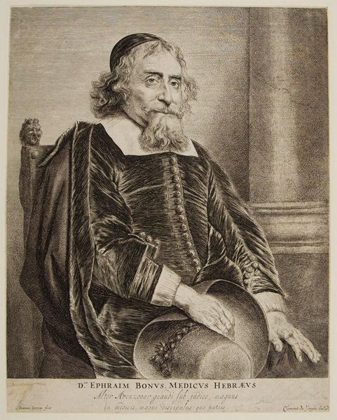 Curator: I find myself immediately drawn to the quiet dignity in this portrait. The subject appears self-assured, yet there is a certain pensiveness in his gaze. What do you see? Editor: The somberness of it is really striking; it's almost a melancholic scene despite the opulence. This work, created by Jan Lievens around 1640-1650, depicts Ephraim Bonus, and what's really interesting to me is its public role as a printed image at that time. Think of the accessibility! Curator: Indeed. Beyond the somber tone, the meticulous rendering of details like the beard, the fabric's texture, or even the slight glint in his eyes contributes so much. It goes beyond mere representation; Lievens uses those symbols to evoke intellectual weight and even a deep cultural heritage. Editor: Absolutely. Its distribution as a print—an engraving—meant it circulated within specific intellectual and perhaps even medical circles, reinforcing Bonus’s standing. How was Lievens, an artist who operated within very specific commercial and patronage networks, attempting to convey authority? The column in the background—what sort of social cue is provided through such a symbolic reference to classical antiquity? Curator: The column speaks to notions of strength and tradition, absolutely. It's part of the visual vocabulary to present Bonus as a figure of lasting importance, maybe tying him to lineages of wisdom extending into antiquity. Also note how light and shadow converge so intensely on his face. It elevates his knowing glance, as if he holds secret insights. Editor: Agreed, and think of the printing process at the time. The choices in tonality and the stark contrasts weren't just aesthetic. They allowed for clarity and readability when reproduced. So, it was very much about efficiently projecting the intended message onto the greatest number of people, bolstering the symbolic impact. Curator: I can almost hear the rustle of the paper, envision this piece being studied amongst scholars... Even now it projects an evocative authority. It underscores the power that images hold. Editor: Yes. Images weren’t simply decorative—they were actively shaping public perceptions and negotiating identities. Examining who and what was considered worthy of depiction in print is crucial. It brings me back to consider that we still grapple with representation and legacy-making in an equally image-saturated environment today.