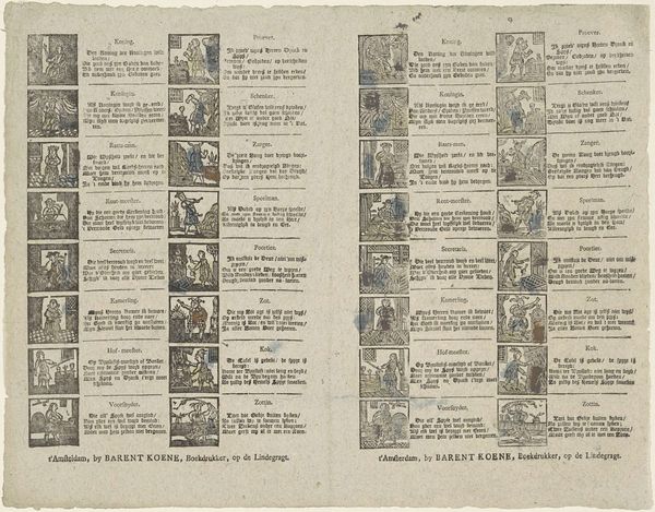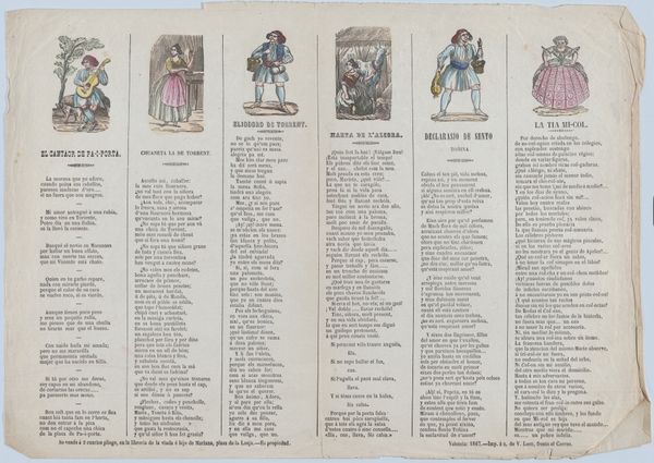 Curator: Here we have a fascinating piece: a recital sheet from 1861 featuring different characters. The artist is Rafael Mariana. It's interesting how the figures are placed within their frames, each topped with descriptive titles. What strikes you first about this work? Editor: The symmetry, definitely! It feels very formally arranged with the different panels laid out next to each other and characters within each panel echoing one another. I'm also curious about the purpose of such a sheet, with the text underneath. How do you interpret this work? Curator: Primarily, I look at the organization of the panels and consider how they interact to create a whole. Notice how each figure, while unique, shares a similar frontality? What effect does that create? Editor: It almost feels like a lineup, like each character is being presented equally for consideration or performance. Curator: Precisely! Consider the deliberate choice of placement, the way each character inhabits its pictorial space. Even the typographical elements, the choice of fonts and their arrangements, play a role. How do these visual elements influence the relationship between text and image? Editor: I think the differing fonts might denote each character's distinct tone, but the woodcut figures illustrate these characters for perhaps home theatre productions. Are the rigid panel arrangements influencing the reader? Curator: Undoubtedly! The panels encourage the reader to engage with the whole rather than fixating on a single element. It dictates how one may prepare or act out these home skits with the rigid lines organizing actors during performances. Editor: That is fascinating. Now I see how all these little formal components create a more complex reading of performance. Curator: Indeed. By examining the relationship of these components, the medium helps me access information regarding intended functionality and aesthetic experience, which could not occur otherwise.