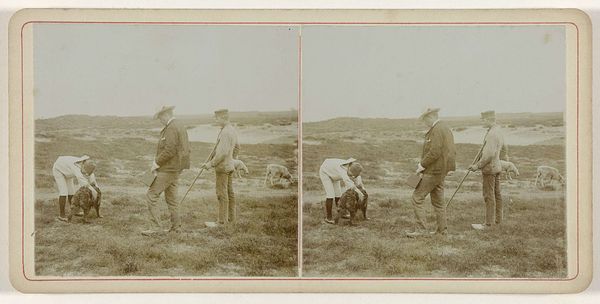 Curator: Here we have a photograph dating from 1889, "Keizer Wilhelm II met zijn reisgezelschap in het Noorse landschap bij uitkijkpunt in Lofoten" or, "Kaiser Wilhelm II with his travelling companions in the Norwegian landscape at a vantage point in Lofoten." It's attributed to Paul Gussfeldt, and presented as a gelatin silver print. Editor: It feels stark, almost alienating. The group of men huddled together looks almost insignificant against that vast, pale sky. Curator: Indeed. Consider Wilhelm II's imperial ambitions at the time, and the backdrop of Norwegian wilderness becomes a commentary. His desire to project power contrasts sharply with the humbling reality of nature's scale. Are they claiming dominion, or are they diminished by the landscape? Editor: It’s interesting you mention dominion. I keep circling back to what they're actually looking *at*. The almost ritualistic posture some of them adopt in looking at the landmark. It seems as if it functions as a potent symbol in that landscape. I wonder what the symbolic weight of this place was prior to the Kaiser's visit? Curator: Precisely. Historical context reveals Wilhelm II’s penchant for staging these kinds of symbolic encounters. Norway, a land of Vikings and sagas, was deeply romanticized in the late 19th century as the very cradle of the Aryan race. Wilhelm II traveled there every year, to stage photographs that created his image of strength. Editor: Ah, the staging certainly reframes the entire image! Did Wilhelm select this area because the point offered some form of pre-existing symbology for power? The vantage point suggests hierarchy too; Kaiser Wilhelm literally gazes down on the rest of the world. Curator: A point well-taken, since even their attire—formal suits in the rugged terrain—serves as a marker of cultural and societal distinction, which adds another layer to the narrative. This photograph isn't simply a record; it is carefully constructed propaganda of imperial prowess against the canvas of what Wilhelm thought of the Nordic lands. Editor: So it's more than just a group of men on a hilltop. It’s about manufacturing and shaping cultural memory. Curator: Precisely! The careful composition hints at performative aspects. A narrative designed to bolster the Kaiser’s image and his association with a romanticised, imagined lineage of northern European power. Editor: Seeing it this way enriches the narrative far beyond a simple landscape shot.