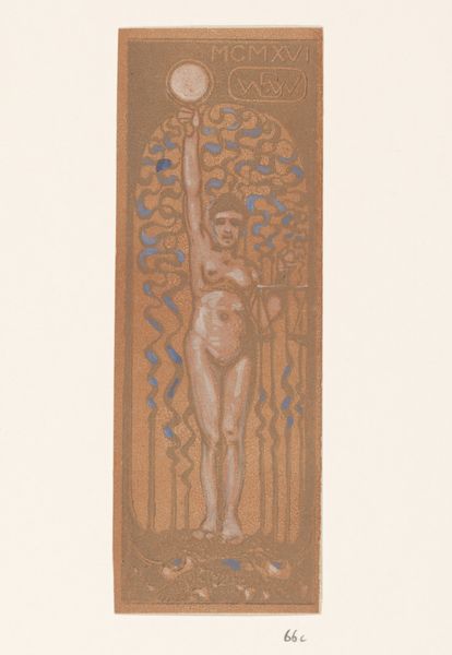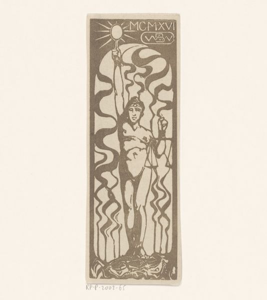 Bernard Willem Wierink created this small print, "Naked Woman with Mirror and Scales," in 1916 using a woodcut technique. The linear quality of the design is evident in the way Wierink carved the woodblock. Notice how the figure emerges from the background, her body defined by bold outlines and subtle textures created by the gouges in the wood. The choice of wood as a material gives the print a graphic impact, well-suited to the symbolist imagery. Woodcut is an old technique, associated with the handcrafting of images. In contrast to industrial modes of production, where uniformity is paramount, each impression taken from a woodblock has a handmade quality. The texture of the wood grain, the varying pressure applied during printing, and the subtle imperfections in the carving all contribute to this effect. This aesthetic choice links the work to wider social issues of labor and artistic expression during a period of industrial change. Ultimately, understanding the material and processes behind this print enriches our appreciation of its cultural significance, blurring the lines between craft and fine art.