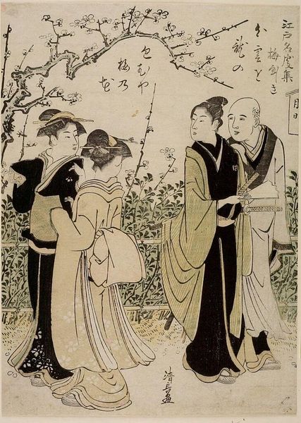 Curator: It has such a delicate feel, doesn't it? It reminds me of a carefully arranged stage. Editor: Precisely. What we have here is Torii Kiyonaga's "Umeyashiki, from the series "Collection of Famous Places in Edo (Edo meisho shu)," dating to about 1782. It's a woodblock print, an example of ukiyo-e, a popular genre reflecting Edo period life. I can immediately think of a connection with current discussions about gender representation and consumer culture, as it so vividly depicts the pleasure quarters. Curator: The clothing itself becomes a kind of signifier. Notice the arrangement of figures – the groupings and implied conversations create a narrative. The women's elaborate hairstyles and exquisite kimono contribute to the atmosphere of cultivated beauty, not unlike how dress shapes identity today. Editor: Yes, absolutely. Each figure holds such potent symbolism. Plum blossoms, which are strongly present, always stand for the arrival of spring and overcoming adversity. It's also related to the idea of female beauty, resilience, and renewal. The plum is thought to be a protective symbol that represents virtue and the spirit's capacity to survive winter’s trials, an idea also found within many traditions. Curator: It also feels important to examine these prints through a contemporary lens. Kiyonaga wasn't just documenting life, but actively participating in shaping and reflecting the social norms of the time. Editor: Exactly. You see these prints being consumed across social lines as objects that reinforced a visual culture that celebrated and codified feminine ideals. I think this makes this work important in revealing the complex and constantly renegotiated representation of women's place. Curator: A powerful message held within what at first glance appears as an idealized scene. Thank you for illuminating this, allowing us to see how these works echo conversations of social importance in present day. Editor: The image itself carries within it the seeds of endless connections. These are representations of how signs continue to influence culture long after creation.