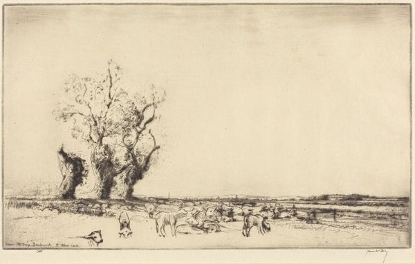 Curator: Let’s turn our attention to James McBey's etching from 1911, titled "Avila." This print captures the cityscape, rendered in a style reminiscent of Impressionism. Editor: My first impression is of a sort of faded dream, almost sepia-toned in its stillness. The skeletal trees feel a little melancholy, reaching for a sky that isn’t quite there. Curator: Absolutely, that muted palette and the atmospheric perspective contribute to a certain nostalgic feeling. "Avila," the city itself, situated in Spain, boasts remarkably preserved medieval walls; here, McBey focuses less on celebrating its architectural grandeur, instead offering us a more nuanced interpretation. Editor: You can feel that history humming beneath the surface. The details are just suggestive, like ghosts. It's as if he's inviting us to fill in the gaps, to project our own sense of time and memory onto the scene. I get a similar feeling from some Corots, but stripped bare. Curator: Precisely. And in terms of historical context, McBey created this work during a time when Europe was on the cusp of significant change. Prints and etchings were also increasingly accessible modes for artmaking, so this landscape connects with themes related to urbanization and mobility. I find that "Avila," rather than being a pure landscape, presents an environment altered through social and material conditions. Editor: I see that. It’s not just a postcard view. There is almost a political element suggested by that far off walled city that contrasts with those trees struggling right up close. It gives a stark picture that’s thought-provoking. The foreground seems… precarious? Almost barren compared to the stoic architecture. Curator: Yes, precarious and somewhat unmoored. Which perhaps, reflects anxieties circulating during that era of industrialization and changing cultural values. The walls stand defiant. McBey reminds us, if indirectly, of shifting cultural geographies, power, and the ways we relate to a landscape deeply imprinted by humans. Editor: It makes me want to look deeper than just pretty scenery. More than a scene to behold, it is one to consider carefully. Thank you. Curator: Indeed. It provides insights beyond surface level observation. An exploration into our perceptions of location, the human imprint, and the enduring power of landscapes.