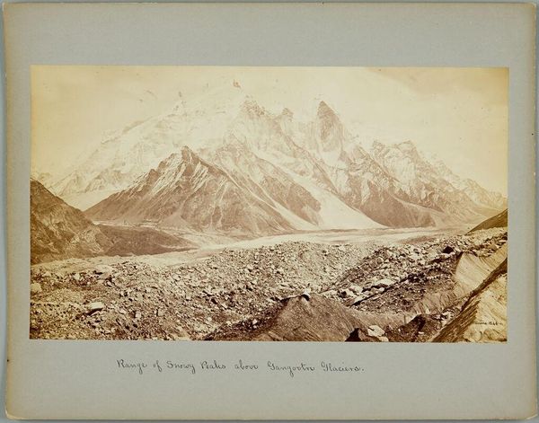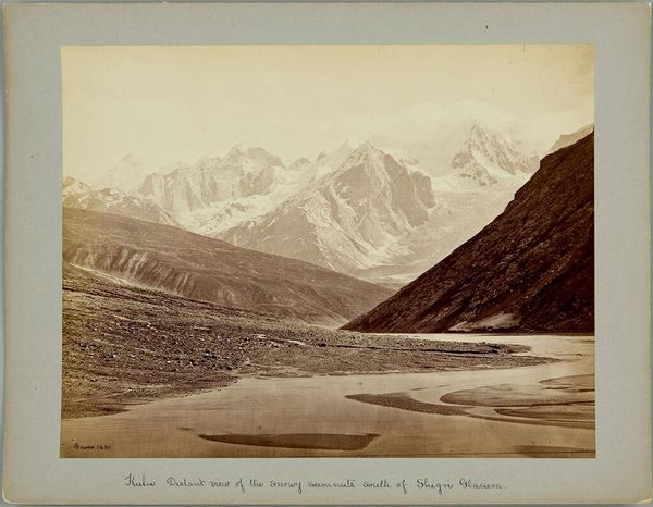 Editor: This is "Kulu, Spiti; View from Hamta Pass" by Samuel Bourne. It's a stunning landscape. The scale is immense, but there’s also a solitary figure. What strikes you most about this photograph? Curator: The photograph offers a visual record of the colonial gaze imposed on the Indian subcontinent. Bourne's aesthetic choices, framing, and focus on the landscape contributed to a narrative of exploration and domination. How does the presence of that solitary figure contribute to or challenge that narrative? Editor: I see what you mean. It looks so small and insignificant. Curator: Exactly. It's through such images that ideas about power and scale were reinforced, impacting both the colonizers and the colonized. We must think about how it perpetuates cultural stereotypes. Editor: I never thought of landscape photography in those terms before. Curator: Analyzing art within its sociopolitical context helps us understand its lasting influence.