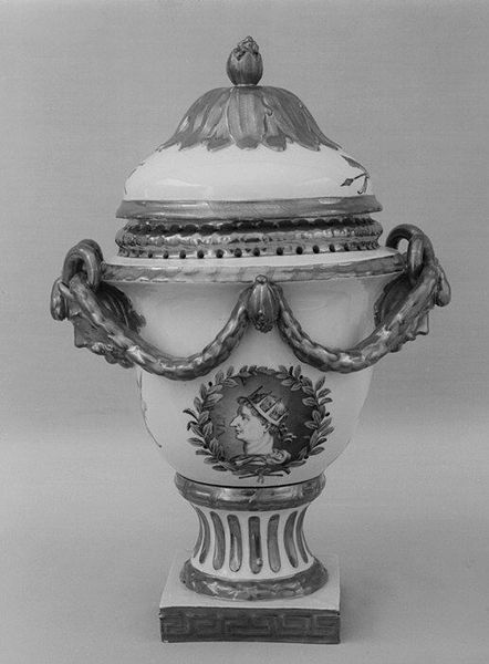 Curator: This porcelain vase, part of a garniture made by the Fürstenberg Porcelain Manufactory between 1775 and 1795, exudes a delicate Rococo elegance. What's your first impression? Editor: Frivolous, yet regal. It’s as if Marie Antoinette decided to take up pottery. The portrait medallions against the ornate foliage... it feels very "let them eat cake," doesn't it? Curator: It does speak to a certain level of courtly opulence. These vases were intended as decorative objects for the wealthiest homes, visual markers of status and refined taste. The delicate porcelain itself was an incredible luxury at the time. Editor: You can almost hear the harpsichord playing, can't you? What intrigues me are the sculptural, almost grotesque mask-like handles. They offer this jarring contrast to the smoothed and classical profile within the painted medallion. Is it meant to be the client whose parlor it decorates? Curator: Perhaps not the client, but certainly someone of significance. Portraiture was incredibly important for maintaining and broadcasting social status and alliances. So putting the idealized image onto functional objects was pretty shrewd. These garnitures weren't simply pretty; they were saying something about the owner’s position in the world. Editor: All that from a vase! But the thing is… doesn't this aesthetic of high ornamentation eventually become suffocating? Does beauty turn into pure artifice at a certain point? Curator: That's the tension with Rococo, isn't it? The desire for lightness, ornamentation, an almost playful artificiality. It rejected the weightiness of earlier Baroque styles, but it's hard to miss that underlying societal inequality baked into these expensive wares. Editor: Still, there’s a certain lightness I can’t help but appreciate. Curator: Me too. They manage to embody a moment in history so effectively, both its artistic exuberance and the social tensions simmering beneath the surface.