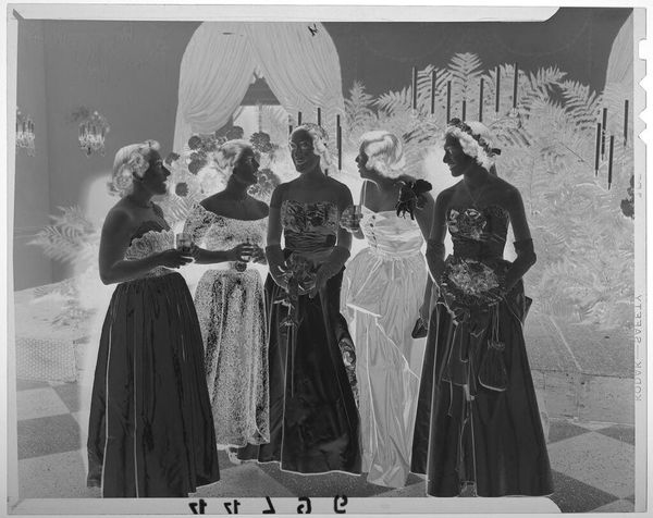 Curator: This photograph by Martin Schweig, currently titled "Untitled (portrait of bride wearing crown-like veil with two bridesmaids)," offers a glimpse into a bygone wedding. Editor: It feels like a memory struggling to surface, doesn't it? Ethereal, almost haunted. The inverted tones lend it such an otherworldly quality. Curator: Precisely. The composition itself is meticulously structured, a study in symmetry with the bride as the central axis, flanked by her bridesmaids. Note the interplay between the figures and the backdrop. Editor: Those palms feel so theatrical, staged. Like a dream of a wedding rather than the real thing. I wonder, what's the story behind those inverted colors? Curator: That likely stems from the photographic process itself, a negative image. It invites us to consider the artwork as a representation, a constructed reality rather than a direct reflection. Editor: It's captivating, and a bit melancholic, don’t you think? It makes you wonder about their lives, their stories frozen in this odd, dreamlike moment. Curator: Indeed. It is a poignant visual study, inviting continuous theoretical and emotional engagement.