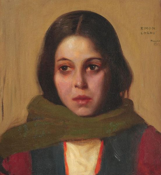 Editor: We're looking at "Wishbone," an oil painting by Nikolaos Gyzis, created in 1878. The subject's gaze is averted, creating a sense of introspection or maybe even longing. There’s something quietly powerful about this piece. What catches your eye, initially? Curator: You know, it's the contrast that grabs me. The rich, almost earthy reds playing against the stark, almost severe blacks of her headscarf and shawl. It feels both intimate and a bit melancholic. It’s as if he’s captured a fleeting moment, a half-formed thought. Don't you get that feeling? As if you’ve caught her mid-daydream? Editor: I do. It almost feels like a stolen glance. Do you think that was Gyzis's intent? To portray this candid moment? Curator: Maybe, or maybe he’s playing with the traditional portraiture of the era, injecting a bit of everyday life and interiority into a formal setting. Romanticism often delved into emotion. Notice how the light caresses her face but leaves the background rather flat? It's like isolating a precious thought from the chaos around it. Makes me wonder about her "wish," the one that's got her gazing off into the distance. Editor: That’s a lovely observation. The lighting really does isolate her, even with that bold red background. It almost feels cinematic in a way, thinking about it now. Curator: Yes, and I think the genius is in that simplicity. It leaves so much open to interpretation. The woman’s own inner life remains just out of reach, tantalizing us. You know, the more I look, the more stories I invent for her. Editor: That's beautiful. I initially saw a kind of wistful sadness, but now I see the possibility for a bit of defiant hope too, especially knowing it’s painted at a time of cultural transformation in Greece. It really invites conversation and speculation. Curator: Exactly. And that, my friend, is the beauty of art. It shifts with our gaze, echoes with our own stories.