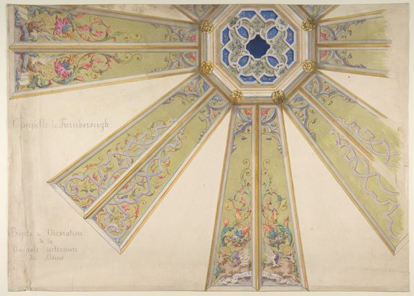 Curator: This is a design for a ceiling decoration, created by an anonymous artist in the 19th century, employing watercolor and print on toned paper. What’s your first take? Editor: A dreamy, almost weightless composition! It’s a wash of muted tones – creams, pale pinks, and faded blues – giving it an ethereal quality. A rococo fantasy floating above. Curator: I see the architectural application too, noting how the drawing visualizes a plan— the gridded spaces intended for the architectural production and spatial labor for ceiling installations, while geometric frames containing figuration echo both the Renaissance and Neoclassical styles. Think of the labor required to scale and realize a piece like this. Editor: Absolutely. And within that labor, there’s also the visual rhetoric: putti and classical motifs arranged within these decorative panels. These angelic figures are often used to symbolize innocence and divine love, of course. It is about creating a very specific kind of domestic atmosphere... but also about exclusion. What labor allowed the decoration of the ceiling to be a task. Curator: Yes, the imagery catered to a certain class. Now, examining the toned paper—it has visible creases, suggesting this wasn’t just a pristine presentation piece, but likely something actively handled in the production process of its time. We can observe areas where watercolor washes meet printed lines, and it makes me think of the artist's careful consideration of medium and sequence in this particular plan. Editor: Consider its function too—this design elevates and mythologizes the inhabitants below. Who are these inhabitants? Were they the patrons? And think about the gendered dimensions—what was the domestic position for women in these types of interiors and in these settings. Curator: And in its function as a blueprint, the object in itself reveals an artisan's hand in materializing ideas within the system of production— revealing not just a concept but a potential site for craftwork that ties into larger structures of decorative making. Editor: Viewing this "ceiling decoration," this reveals social and gender history. Not simply a record of high-society aesthetics, but traces and labor needed for that luxurious, imagined and exclusionary ideal to come to material being. It becomes a window onto a more complex narrative. Curator: Exactly! A look behind the surface, so to speak, at the collaborative labor embedded within that gilded picture. Editor: A view beyond.