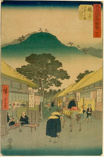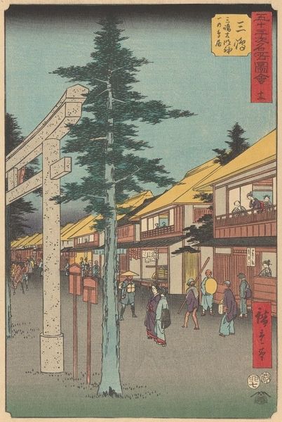 Curator: This is Utagawa Hiroshige II's "Yanagishima Miyoken" from the series *Thirty-Six Views of Yedo*. Look at the vibrant colors. Editor: It's captivating, isn't it? I'm immediately drawn to the human element, the figures traversing the bridge. What can we say about their representation? Curator: The figures embody a tension between public performance and private lives, a tension that's very much at the forefront in Edo period art. Note how they appear in relation to the architecture. Editor: That's fascinating. Thinking of the bridge, does it represent something about class and gender? Curator: Bridges are liminal spaces, not just architectural feats, but conduits for societal transformation. They carry heavy symbolic weight within Edo-period art. Editor: I'm leaving with a deeper appreciation of how art can be a lens through which to view history. Curator: Absolutely, a way to engage with our shared past.