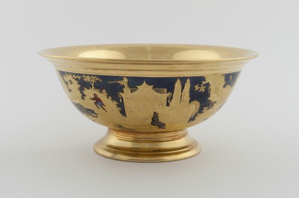 Curator: Let’s take a look at this "Tazza," a ceramic piece from around 1850. What strikes you first? Editor: An immediate sense of precariousness, but also, undeniable opulence. The mottled bowl seems almost to swim above the elaborate base. It definitely brings into focus ideas around colonial trade of luxury objects, and how such "precious" things are really defined. Curator: Yes, the surface does evoke something primal; I'm intrigued by how the material quality relates to the refined execution of the ornamentation along the base. Did they fire it using tortoiseshell for glazing effects or another glazing type that mimic this unique surface finish? Editor: Right. I think it brings into view tensions concerning consumption, status, and appropriation of the rare and exotic into commonplace things that are found in households and personal decorative things like jewelry design. The 'Tazza' itself—what's contained, for whom? It speaks of empire. Curator: I agree. Thinking structurally, the base offers a kind of visual dialogue. The play between the ornate, detailed enameling, the gold trim, and the more primal character of the ceramic on top—each layer offers a new way of perceiving what constitutes "value". It definitely gives more visual meaning in terms of contrasting each of these components with their respective unique traits that are found inside of one object like this tazza! Editor: The very symmetry of the piece tries to convey social order and propriety. This speaks loudly of both gender and class dynamics; the meticulous decoration hints at restrictive ideas concerning the decorative skills of women during this period and even speaks to the rigid class structures which demanded a visual display of wealth. The 'Tazza' transforms, reflecting and reinterpreting historical and theoretical constructs. Curator: Your historical analysis is valuable here. Looking again, one can see this dialogue that both mirrors, contrasts and even possibly rejects societal norms of that period. I see more than "just a pretty vessel"—it is a multi-layered experience! Editor: Precisely. Examining "Tazza," it seems it provokes deeper reflection. It gives me renewed conviction about our duties to consider our collection inside complex intersections!