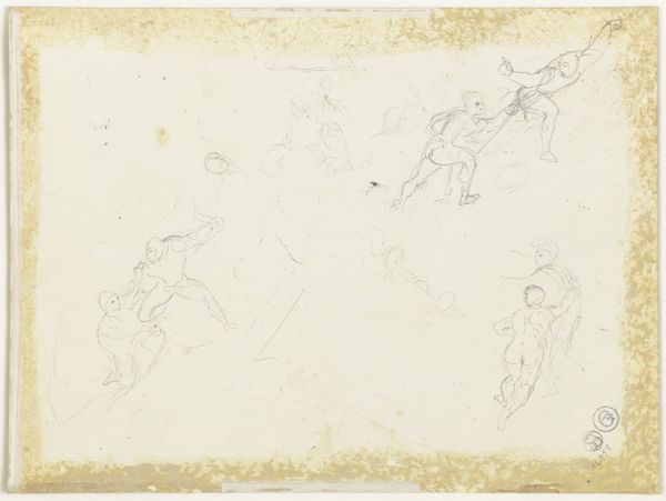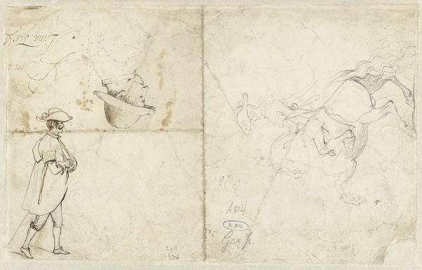 Editor: Here we have Pieter Dupont's "Studieblad met ploeg en man met dubbel span," a pencil drawing on paper from 1901. The light strokes give the scene a delicate, almost ghostly feel, don't you think? What draws your eye in this sketch? Curator: Indeed. It is precisely that ethereal quality, almost as if it's emerging from a dream, that resonates. Consider the enduring symbolism of the horse, often tied to notions of virility, strength, and labor. In agrarian societies, like the one Dupont depicts, horses represent a deep connection to the land, sustenance, and the cycle of life. What feelings are evoked when you consider that such images used to connect people so intrinsically to these cycles? Editor: I hadn’t thought of it that way, but now I see a sense of harmony, almost, even in the backbreaking labor. Does the figure of the farmer also carry significant symbolism? Curator: Absolutely. The farmer becomes a figure of persistence and human interaction with the earth, burdened but still present, reminiscent of ancient agricultural deities. Notice how Dupont positions the farmer, his body angled, actively directing and almost mirroring the tension and exertion within the powerful bodies of the horses. Does this tension reveal any social dynamic for you? Editor: It's almost like they are parts of a single machine or system, working towards a shared goal. Curator: Precisely. Now think of that dynamic played out across the wider landscape of early 20th-century agrarian society. Consider that this is no casual observer's drawing, it is a "Studieblad," a practice or study page in preparation for a bigger artwork; there’s even another hat faintly sketched as the artist builds his arsenal of cultural referents! The drawing thus operates like a portal, bridging personal exertion, the symbols of animals, people and progress and nature's grandeur into collective memory. Editor: It's fascinating how one image can hold so much history and meaning. Thanks, that's really given me a lot to consider. Curator: My pleasure. May this 'Studieblad' inspire a deeper exploration into the rich tapestry of cultural iconography present in our everyday lives!