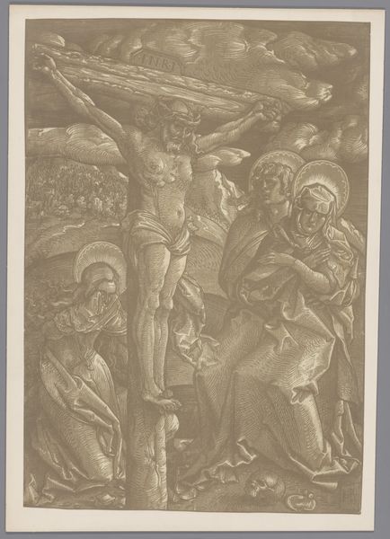 Georg Matheus created this artwork, *Martha and Magdalen Ascending the Steps of the Temple*, using woodcut as his medium. The composition immediately strikes you with its dynamic arrangement of figures and architectural elements, all rendered in contrasting tones. The contrast creates a textured surface that invites tactile exploration. Here, the artist uses the structure of the temple steps not only as a physical setting but also as a symbolic representation of hierarchy and access to knowledge. The figures are carefully placed, with Martha and Magdalen presented in a way that emphasizes their active engagement with the teachings being imparted. Note the linear perspective; it directs our gaze towards the central figures and the temple. The architecture provides a structured backdrop, juxtaposing human emotion and divine wisdom. The temple, with its geometric precision, serves as a signifier of order and spiritual enlightenment, contrasting with the more fluid and emotive gestures of the figures. Ultimately, this woodcut functions as a semiotic system. The forms of the bodies, the construction of the temple, and the arrangement of figures—all come together to create a narrative, inviting continuous reinterpretation.