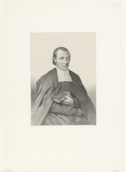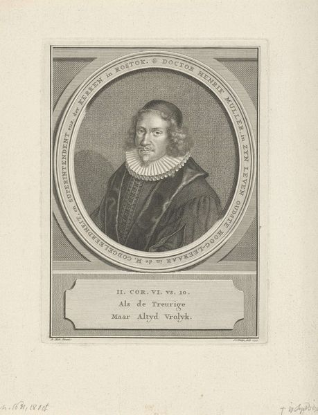 Hendrik Wilhelmus Last created this portrait of Jacob Cats using lithography. The composition centers on Cats's upper body, framed within a vignette that softens into the light background. The artist's lithographic technique captures the contrast between light and shadow, giving form to the man's features and clothing. Consider how Last uses the linear quality of lithography to define shapes and textures. The precise rendering of Cats's face, hair, and the folds of his garments, creates a palpable presence. The texture is rich and detailed, from the soft waves of his hair to the crisp lines of his collar, achieved through a careful manipulation of light and shadow. The circular vignette is not merely a decorative choice. It isolates Cats, focusing attention on the individual and inviting contemplation on his character and status. Last’s strategic use of form, light, and texture constructs a narrative and reflects broader cultural values. It’s a cultural artifact open to ongoing interpretation and appreciation.