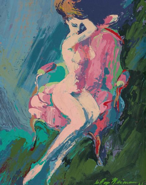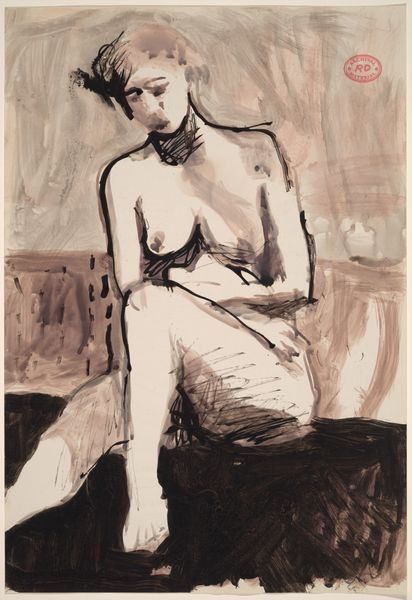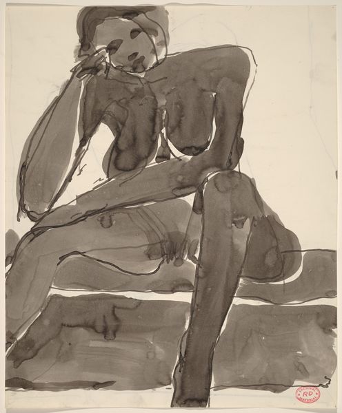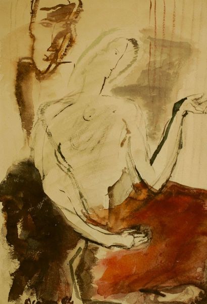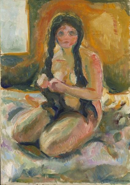Curator: Here we have Alexandre Jacovleff’s 1938 piece titled “Nude.” The artist primarily worked with oil paint in creating this image, also making use of a drawing style that contributes to its distinct aesthetic. Editor: There’s a real vulnerability to this piece, an almost raw energy. It’s intriguing how the bold reds in the lips and cheeks contrast so starkly with the softer, almost tentative lines defining the rest of the figure. The use of black in her garments against the more sensual hues creates a compelling dynamic. Curator: Indeed. Jacovleff worked in a tumultuous period. One sees this figure as a challenge to the art institutions that generally depict women in more sanitized versions of glamour. How interesting is that contrast! The tension with this historical moment and the very public roles for female portraiture. Editor: Absolutely, it shifts the focus away from mere physical representation. I’m drawn to the textural quality, almost like layers of unearthed history—a building-up and scraping-away of oil paints revealing a body almost fought into existence. Look at the raw marks he employed; you feel the hand of the artist present in the artwork's facture. What’s fascinating to me is that you can perceive an interplay of the human condition with each visible brush stroke and material choice. Curator: You raise a key point in focusing our understanding toward a critical assessment, namely to analyze how artistic interpretations were and continue to be impacted through socio-political conditions. One needs only consider the historical representation of “nudes” as compared with Jacovleff's individual representation, and even more the circumstances surrounding his production during that specific period, as they continue to play into his reception today. Editor: Considering those visible brush strokes and their physicality within art historical moments reminds me of our obligation to continually challenge those highbrow separations in art. Material matters when reflecting on Jacovleff's artistic choices. It underscores labor and physicality in creating the form. Curator: I find that our discussion brought light to understanding Jacovleff's social critique but with an impressive understanding for the impact his social surroundings may have played in that artistic critique. Editor: The power of examining both production methods, materials, and historical context allows an evermore dynamic conversation on the socio-political meanings that exist in “Nude.”